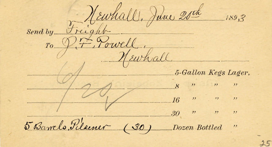 Postcard handwritten from John F. Powell, ordering a shipment of Pilsener beer from the Maier and Zobelein Brewery in Los Angeles.