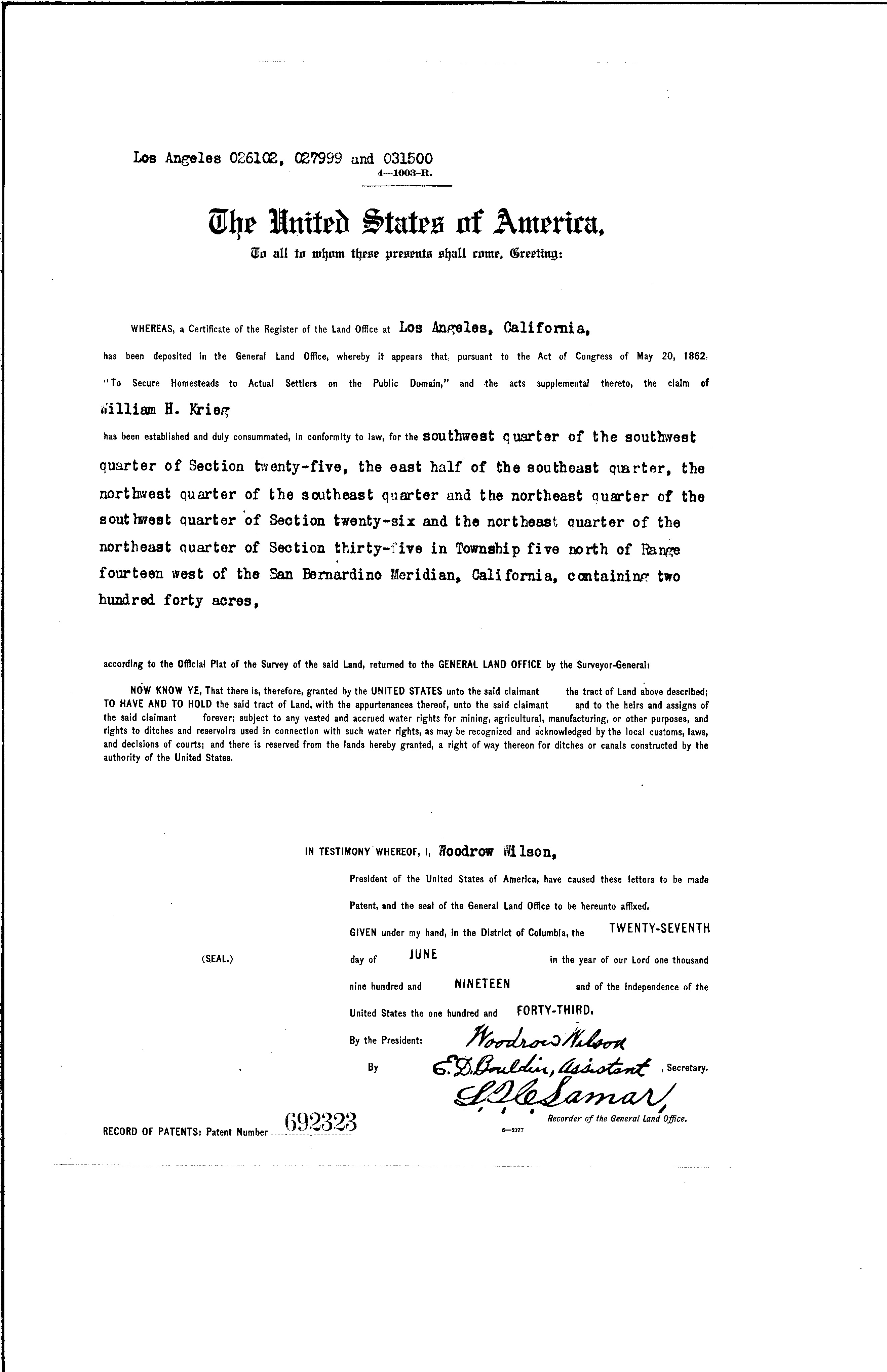 Webmaster's note. Vasquez Rocks marketing brochure from the early 20th Century when the rocks were privately owned. Undated; probably issued in the 1930s by homesteader William "Henry" Krieg or by his nephew, Ray Toney, who inherited the property after Krieg's death in 1937. The brochure capitalizes on the legend of the notorious bandit to attract tourists and/or film companies, which were major sources of subsistence income for the owners. It was probably Krieg — who arrived about 1910 (Rismanchi 2001) and received his homestead patent in 1919 (see below) — who gave the rocks their name. Part of the Sierra Pelona range, they were previously known as the Chicalopes, an anglicization of Francisco "Chico" Lopez. A prominent Angeleno, Lopez owned a large ranch in the latter half of the 1800s at Elizabeth Lake — which was called La Laguna de Chico Lopez before it was called Elizabeth Lake. Placerita Canyon gold discoverer Francisco Lopez was a cousin to Chico Lopez. Chico Lopez's ranch foreman was Chico Vasquez, brother of Tiburcio Vasquez. Odd, how Lopez's cattle and mules went missing when he was away from the ranch. Just how often Tiburcio Vasquez hid out at the rocks, we don't know. He did hide out in upper San Francisquito Canyon, near La Laguna de Chico Lopez. For a competent history of Tiburcio Vasquez, read Boessenecker 2010 or watch Boessenecker's video presentation. For the ownership and film history of Vasquez Rocks, watch Sarah Brewer's 7-part history. Brochure text follows.