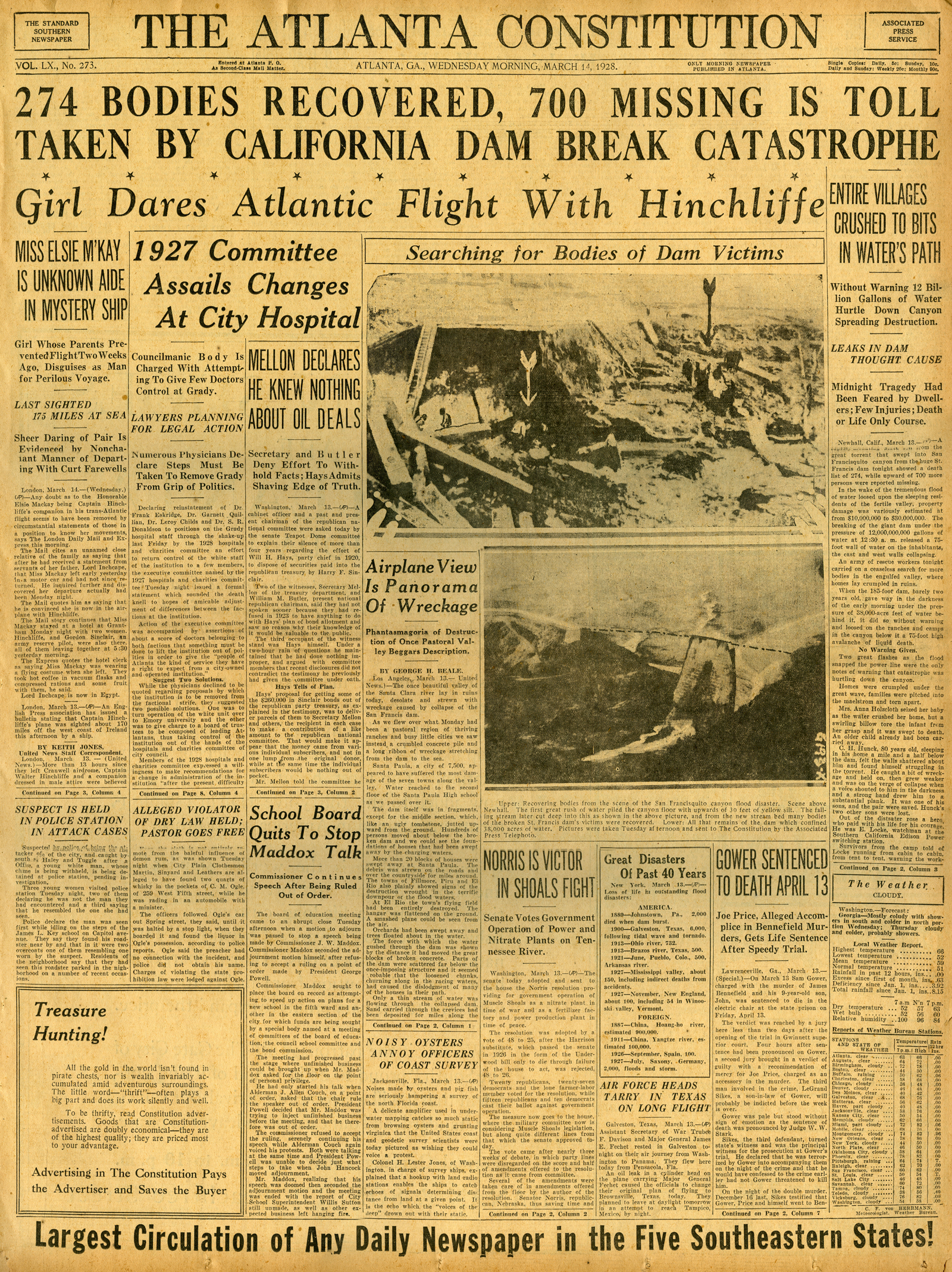 As can be seen in this Atlanta, GA newspaper from March 14, 1928, the St. Francis Dam disaster was big news and made huge banner headlines all over the country when first reported in the press. Today this second largest disaster in California history is mostly forgotten in the rest of the country but well remembered in the Santa Clarita Valley.