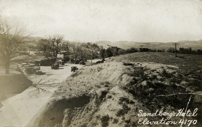 According to Ridge Route historian Harrison Scott, Norwegian-born Harald Sandberg erected a one-story hotel in 1914 in anticipation of the 1915 opening of the Ridge Route highway. In 1918 he was appointed postmaster and the area was officially named Sandberg.