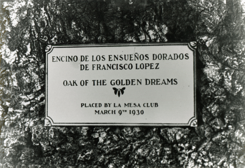 of Newhall-Saugus — a plaque was placed on March 9, 1930, the 88th anniversary of the Lopez discovery, at the site of the tree that is now