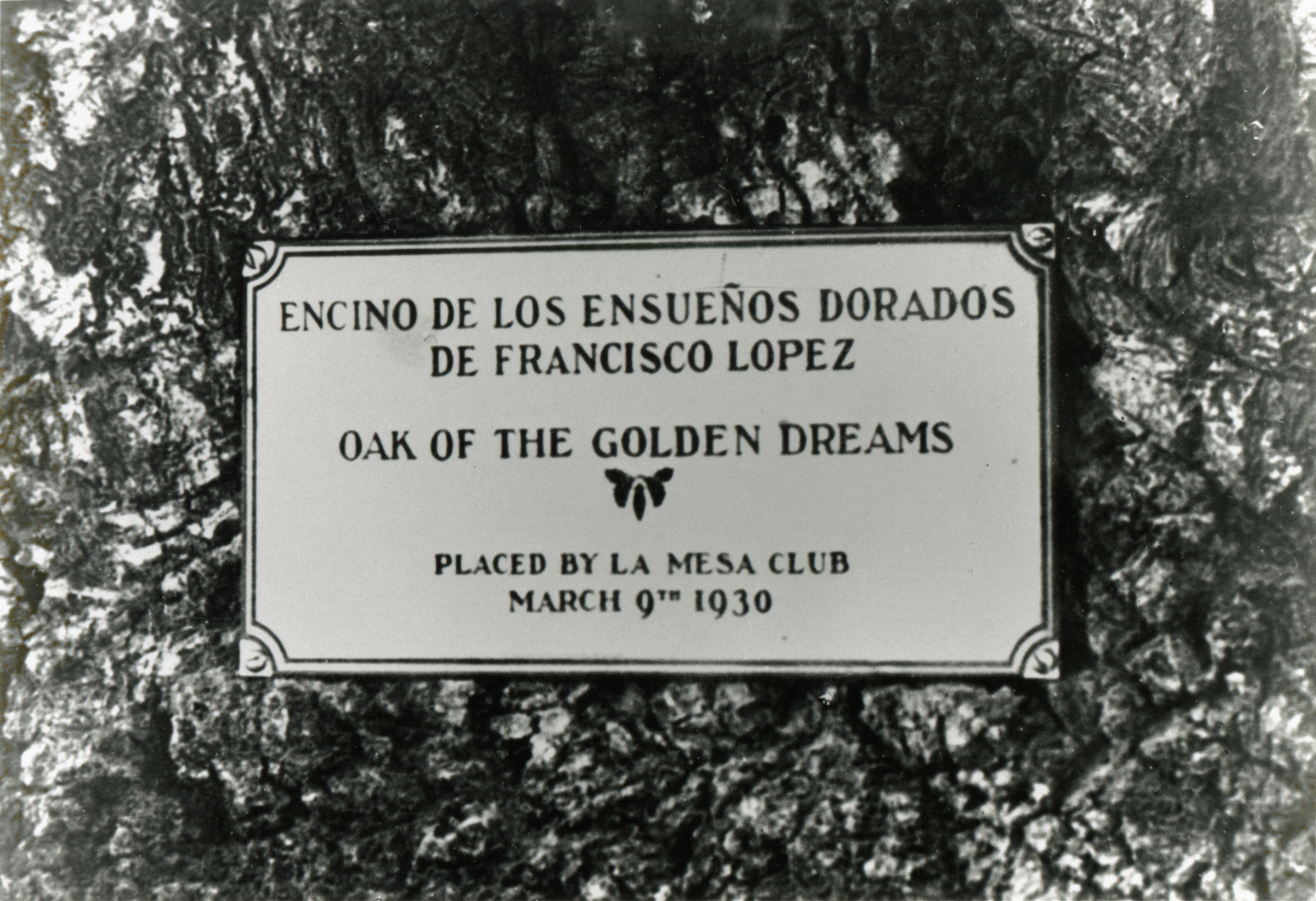 Plaque bolted to the Oak of the Golden Dream (or, Dreams) in Placerita Canyon, upon the dedication of the tree, March 9, 1930.