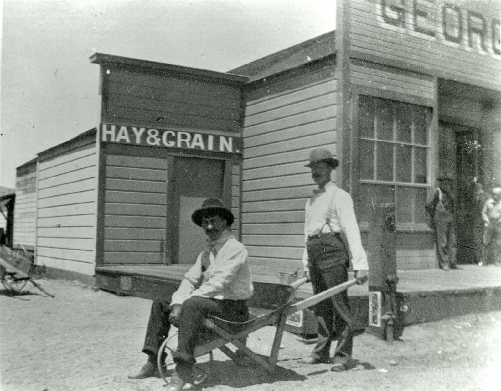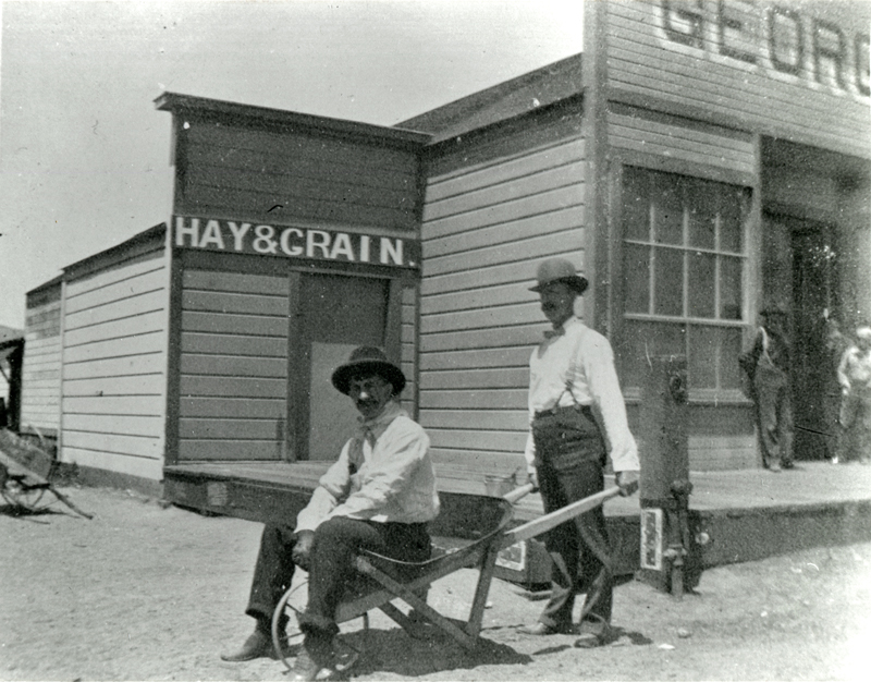 Two guys fooling around in front of George Campton's general store, located at the southwest corner of Railroad Avenue and Eighth Streets in Newhall. The man at center-right could be Campton.