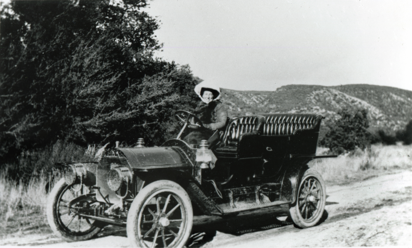 Frances Delano Phillips, a widow who operated a rooming house cafe as well as serving on the school board and PTA, was the first person in the Santa Clarita Valley to own an automobile. Phillips purchased her Cadillac in 1908 and is shown driving in Placerita Canyon the following year.