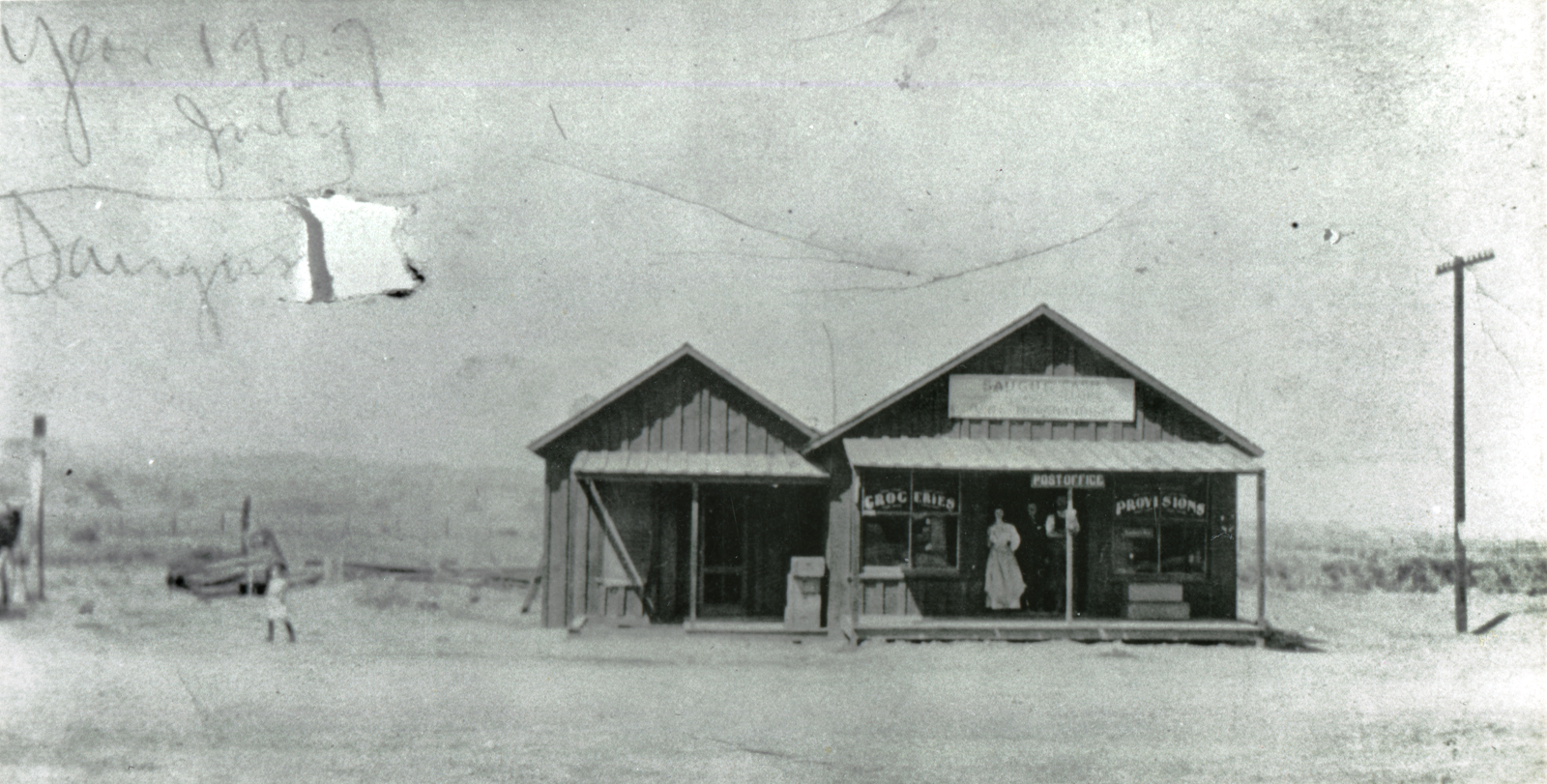 Early version of Ore W. Bercaw's general store, seen here in July 1907. It opened April 25, 1906, on the west side of Bouquet Canyon Road roughly across