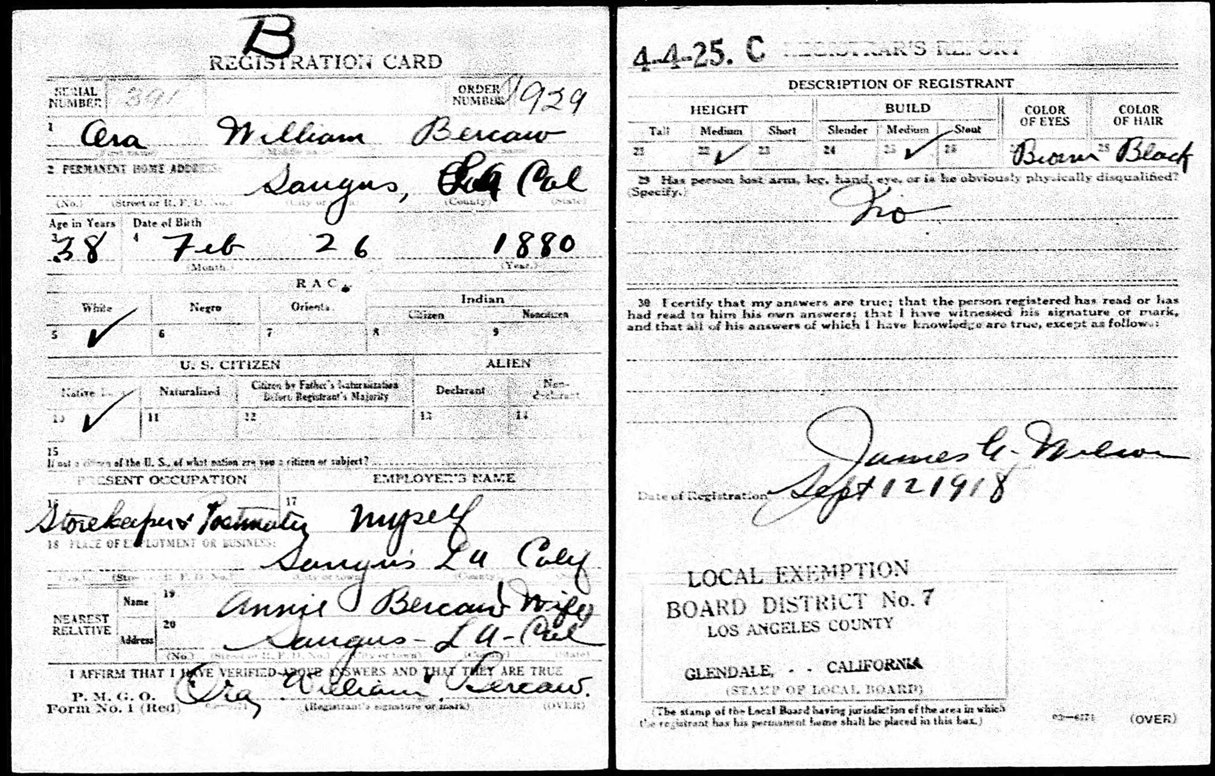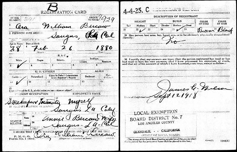 Ora W. Bercaw's World War I draft card. Click to enlarge.