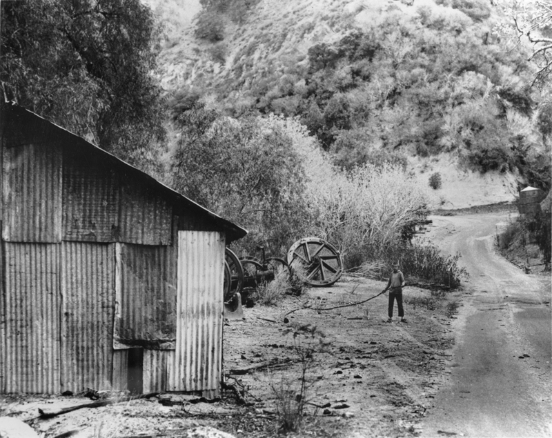 Mentryville resident Darryl Manzer, age 11 or 12 (b. Jan. 14, 1950), holding a sucker rod and standing next to the "firehouse" below PCO Hill, on the left (south) side of the road, roughly opposite the famous CSO No. 4 oil well.