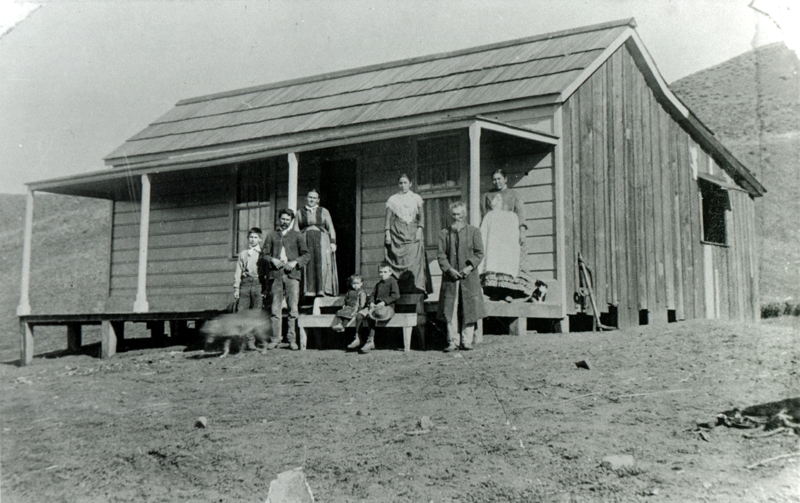 The Dolores Cook family and members of the Cordova family gather on the porch of the Cordova ranch house for a photograph in about 1886.