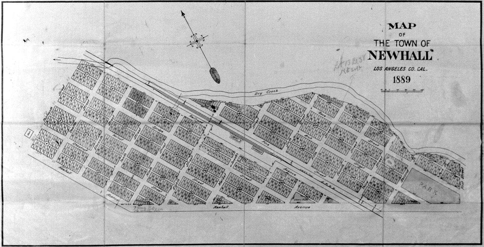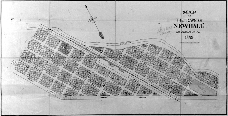 This plat map of downtown Newhall, dated 1889, pinpoints the location of the Southern Pacific Railroad's Newhall depot at the northeast corner of Railroad Avenue and Market Street. Spruce Street, one block to the west, was realigned in the 1920s and became San Fernando Road (renamed "Main Street" in 2007). Tenth Street, also known as Pico Road, became Lyons Avenue.