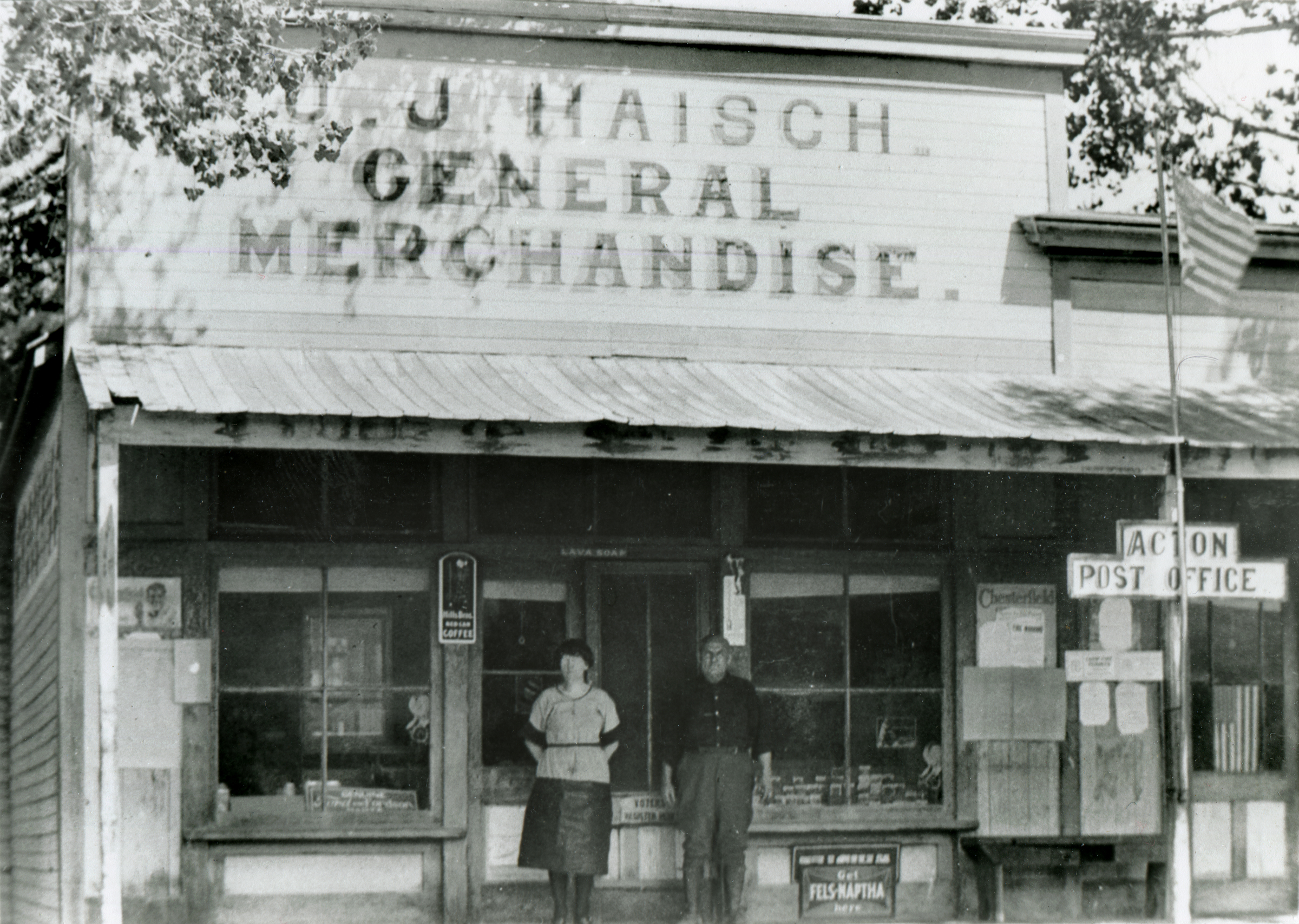 Mr. & Mrs. J.J. Haisch in 1923, in front of their general store on 4th Street (later called Crown Valley Road). It doubled as the Acton Post Office, J.J. Haisch serving as postmaster. A sign announces that voters can register here. Also advertised are Chesterfield cigarettes, Lava soap, Hills Bros. coffee and Fels-Naptha, a laundry bar and stain remover.