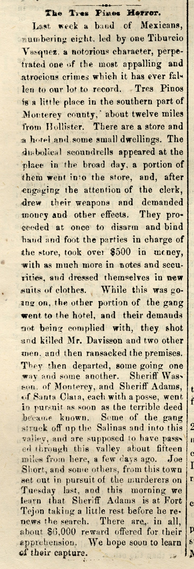 Last week a band of Mexicans, numbering eight, led by one Tiburcio Vasquez, a notorious character, perpetrated one of the most appalling and atrocious crimes which it has ever fallen to our lot to record. Tres Pinos is a little place in the southern part of Monterey county, about twelve miles from Hollister. There are a store and a hotel and some small dwellings. The diabolical scoundrells appeared at the place in the broad day, a portion of them went into the store, and, after engaging the attention of the clerk, drew their weapons and demanded money and other effects. They proceeded at once to disarm and bind hand and foot the parties in charge of the store, took over $500 in money, with as much more in notes and securities, and dressed themselves in new suits of clothes. While this was going on, the other portion of the gang went to the hotel, and their demands not being complied with, they shot and killed Mr. Davisson and two other men. and then ransacked the premises. They then departed, some going one way and some another. Sheriff Wasson of Monterey, and Sheriff Adams, of Santa Clara, each with a posse, went in pursuit as soon as the terrible deed became known. Some of the gang struck off up the Salinas and into this valley, and are supposed to have passed through this valley about fifteen miles from here, a few days ago. Joe Short, and some others, from this town set out in pursuit of the murderers on Tuesday last, and this morning we learn that Sheriff Adams is at Fort Tejon taking a little rest before he resumes the search. There are, in all, about $6,000 reward offered for their apprehension. We hope soon to learn of their capture.