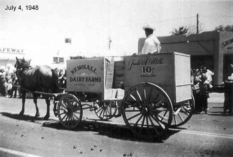 in downtown Newhall. (Yes, July 5th, not the 4th as stamped on the photo.) The driver is dairyman Bud Lutge, according to his son Dennis Lutge (per Paulette Tcherkassky, p.c. 2018).
