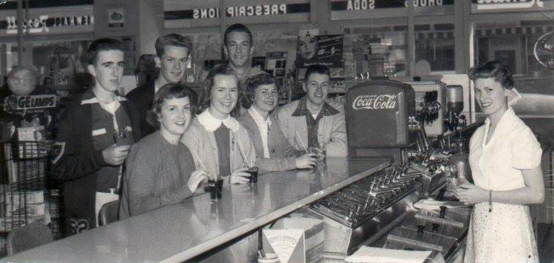 Back row, from left: Earl Vanasen (Hart Class of 1952), Chris Elam, Ross Williams (Hart Class of 1952); front row, from left: Margie Ludlow, Jeannie Driscoll, Lillie Wright, Doug Stewert; at right: Nancy Smith; inside Ralph Williams' Newhall Pharmacy (Rexall Drug) at the southwest corner of Spruce (now Main) and Market streets in 1952.
