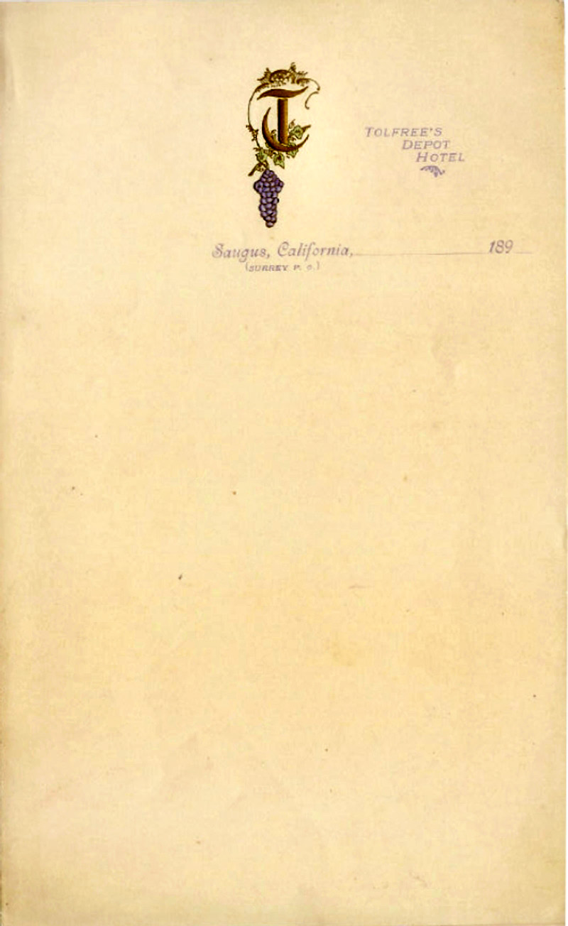 The letterhead indicates that Tolfree was running a hotel inside the depot in the 1890s. It's beleived he let the rooms upstairs; don't know exactly where the stationmaster lived at the time. Later stationmasters lived inside the depot. (It is possible the earliest stationmaster[s] didn't, as the Newhall stationmaster, John Gifford, lived in a freestanding home that faced the Newhall depot.) Also note, as indicated on the letterhead, that this section of Saugus was known as Surrey from 1906-1915. The name "Surrey" appearing in conjunction with a date of "189_" is a mystery.