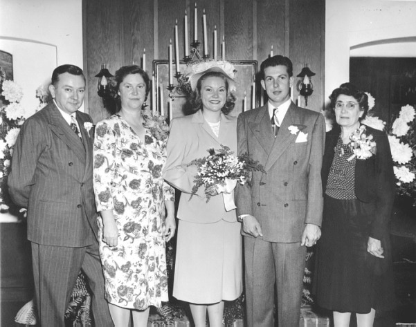 Wedding photo of Paula Palmer and Clement Kenneth Cox. Clem, the second of three boys, was born in Sand Canyon in 1924 after the arrival a year earlier of his parents, Clement Dunbar Cox and Leona Cox. Paula arrived in Sand Canyon in 1939 at age 13. They were next-door neighbors. (From left): Paula's father, Paul Palmer; her mother, Edith; Paula; Clem; Leona Cox. (Clement Dunbar Cox died from pneumonia when Clem Jr. was 5.)