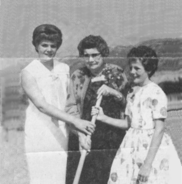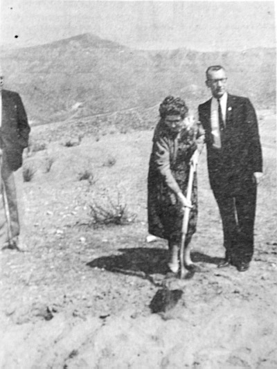 Aug. 1, 1963: Leona Cox (center) at the groundbreaking of Leona Cox Community School in Canyon Country (North Oaks). Click to enlarge.