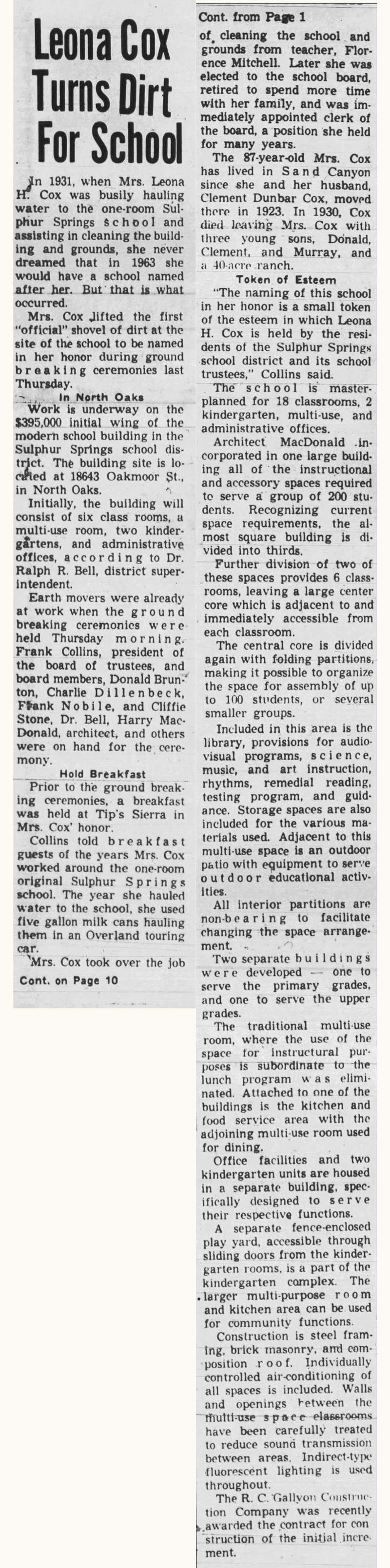Aug. 1, 1963: (Caption as published): Leona H. Cox lifts the first "official" shovel of dirt at the site of the school to be named in her honor. Frank Collins, president of the Sulhpur Springs school board, assists her at the groundbreaking ceremony. (Click to enlarge.)