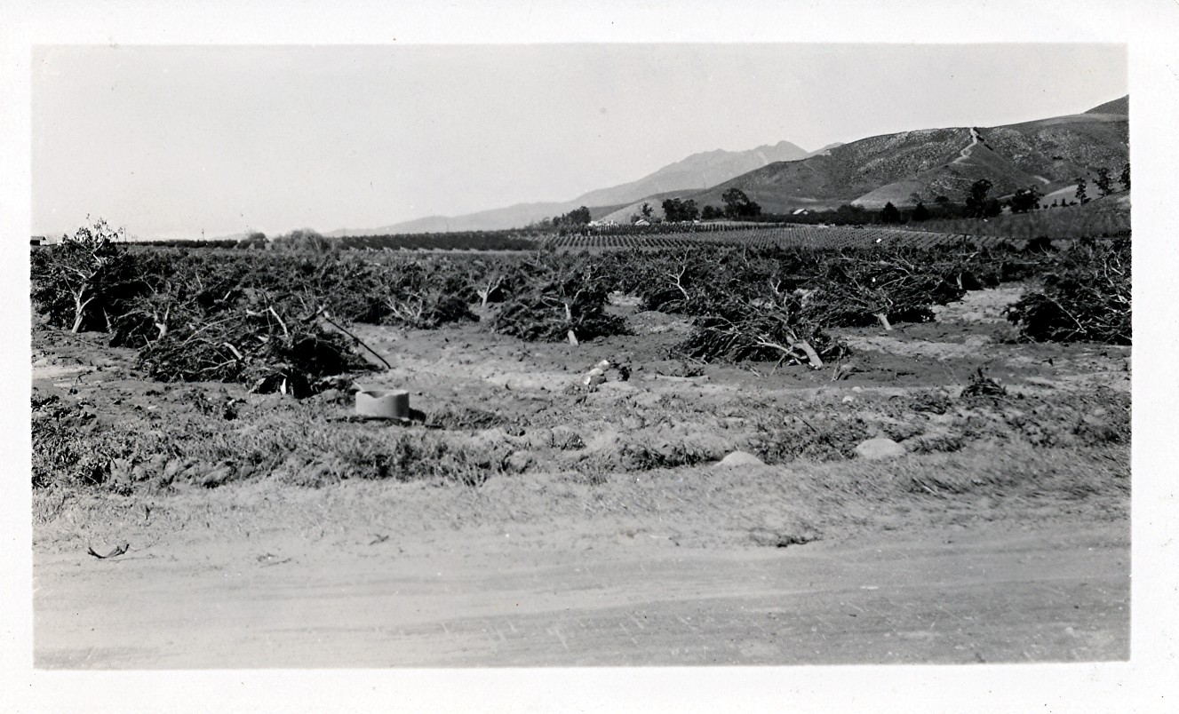 Floodplain of the St. Francis Dam disaster. This is Cavin Crossing, between Piru and Fillmore in the Santa Clara River Valley. Photos courtesy of Caroline and Glenn Marshall; shot by Caroline Marshall's grandparents on March 13, 1928. | ||