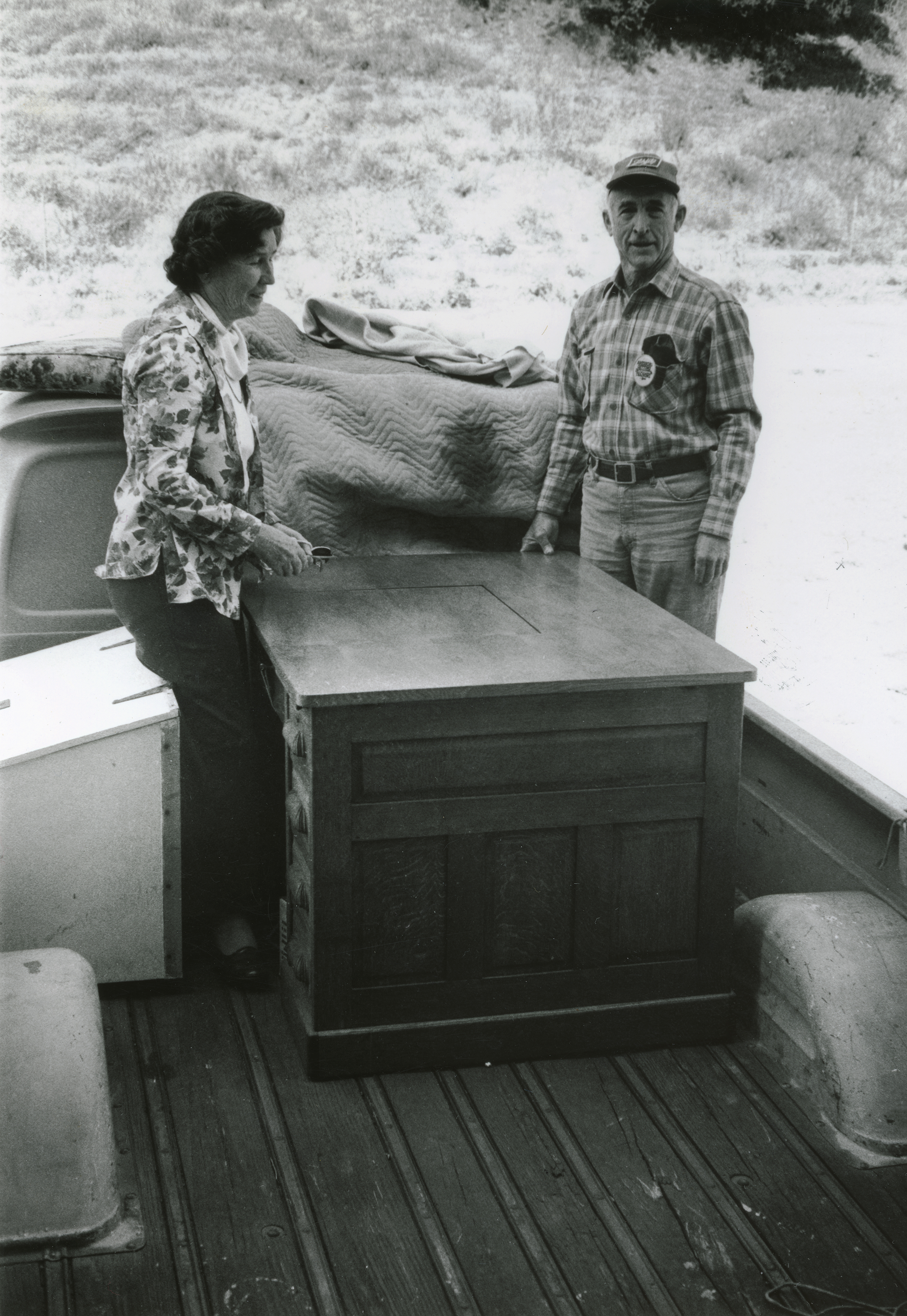 A piece of Saugus joins another piece of Saugus in Newhall: Margaret and Marlen Seltzer donate a desk that came from the general store in Saugus that was owned and operated by Margaret's father, Ore W. Bercaw, in the early 1900s.