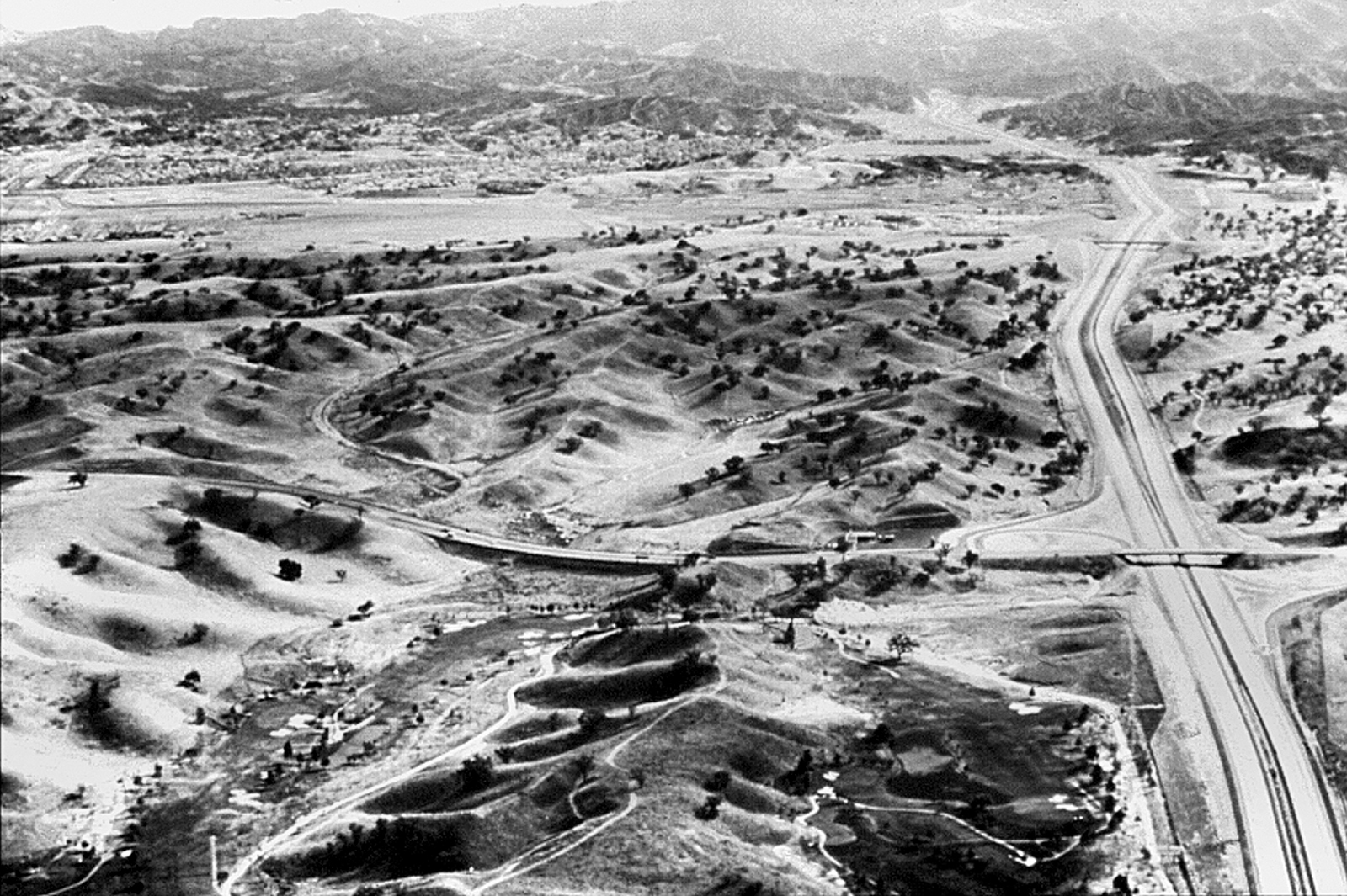 south across the western Santa Clarita Valley in the late 1960s. Interstate 5 is on the right, with Valencia Boulevard cutting across the