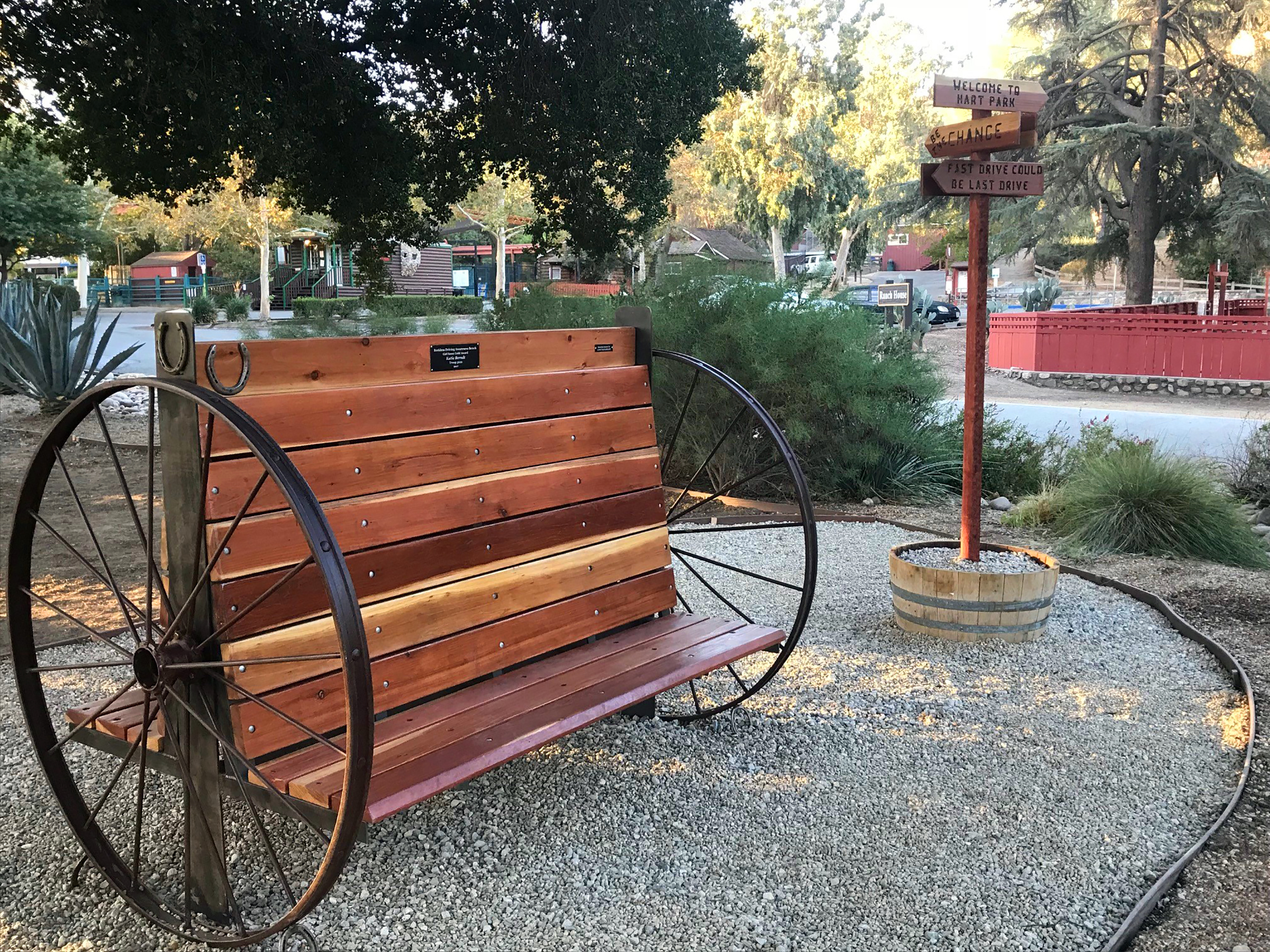 Said Hart Park Superintendent Eric Reifman: "Ms. Berndt exceeded my expectations by designing the bench to look like a western wagon with wagon wheels. To take her project one step future, she created a sign post with directional slogans that read, 'Welcome to Hart Park,' 'Be the Change,' 'Fast Drive Could Be Last Drive,' and more," Reifman said. "Her project was carefully planned out all the way to the location. The bench is next to an extremely busy roundabout in Downtown Newhall where hundreds of people drive during their daily commute.