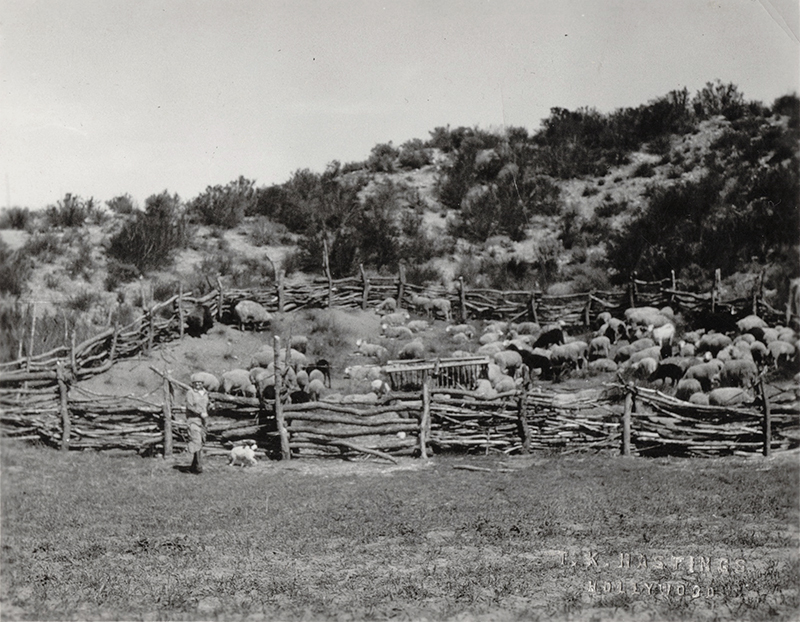 Undated photograph with an unidentified person in it. Harry Carey Jr. (Dobe) identified similar photos as 1926 or 1927. He referred to the sheep as "Navajo sheep," a reference to the Navajo workers who lived at the ranch until about one month prior to the St. Francis Dam break of March 12-13, 1928.
