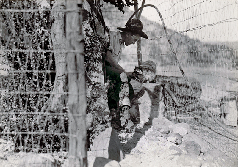 Harry Carey (Sr.) appears to be feeing this raccoon at his ranch in San Francisquito Canyon, just north of today's Copper Hill Drive.