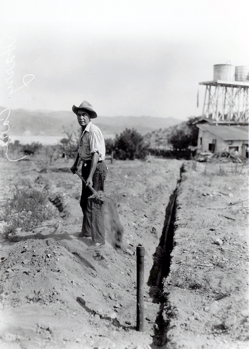 Actor Harry Carey at work on his ranch at the mouth of San Francisquito Canyon after the St. Francis Dam broke.