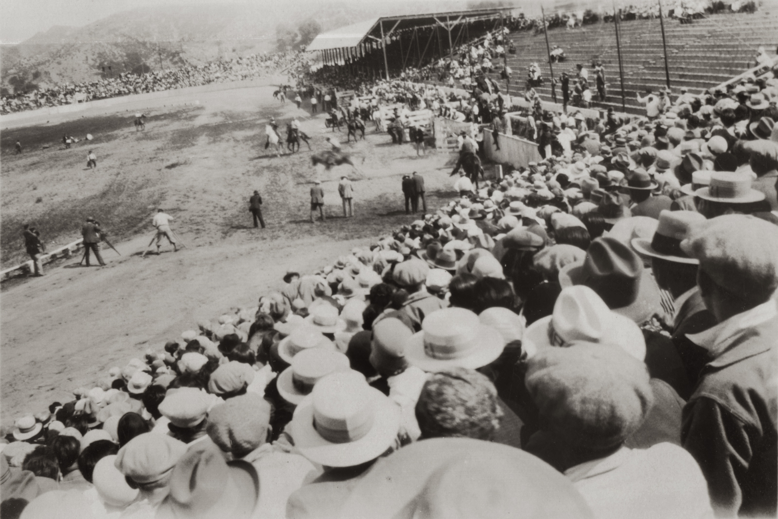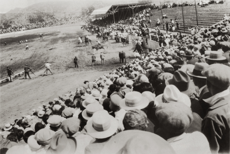 May 1, 1927 — Photographers line the track to catch the inevitable wreck as a bronc leaps from the chute at the 1927 Baker Ranch Rodeo in Saugus.
