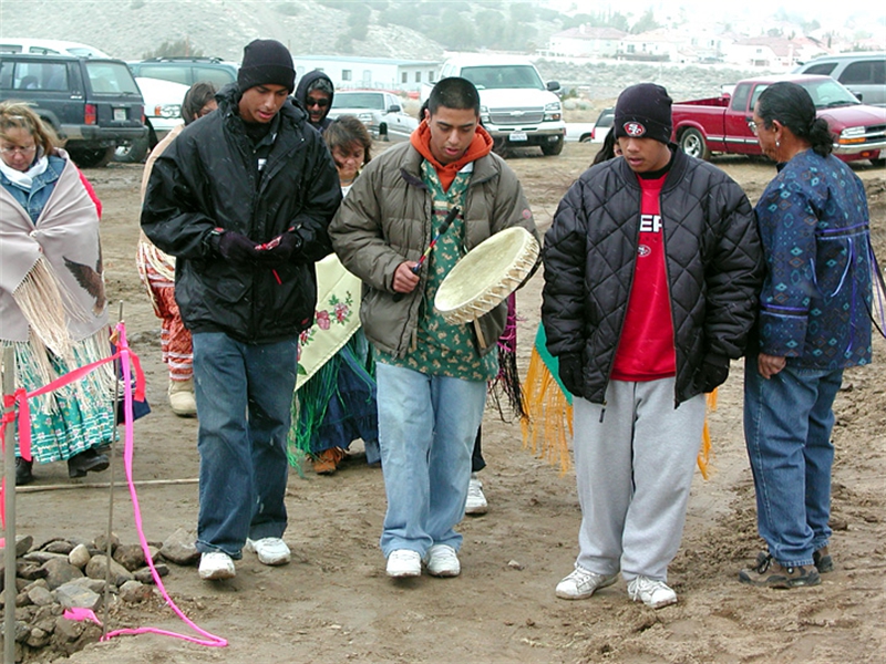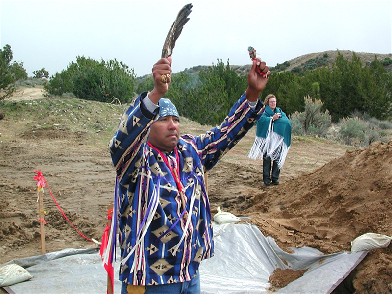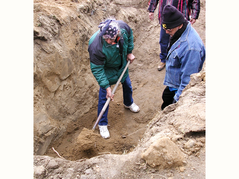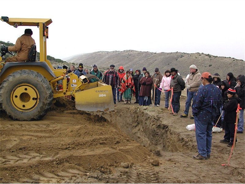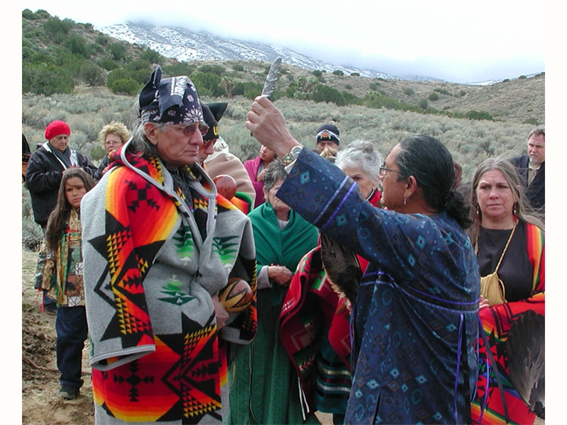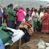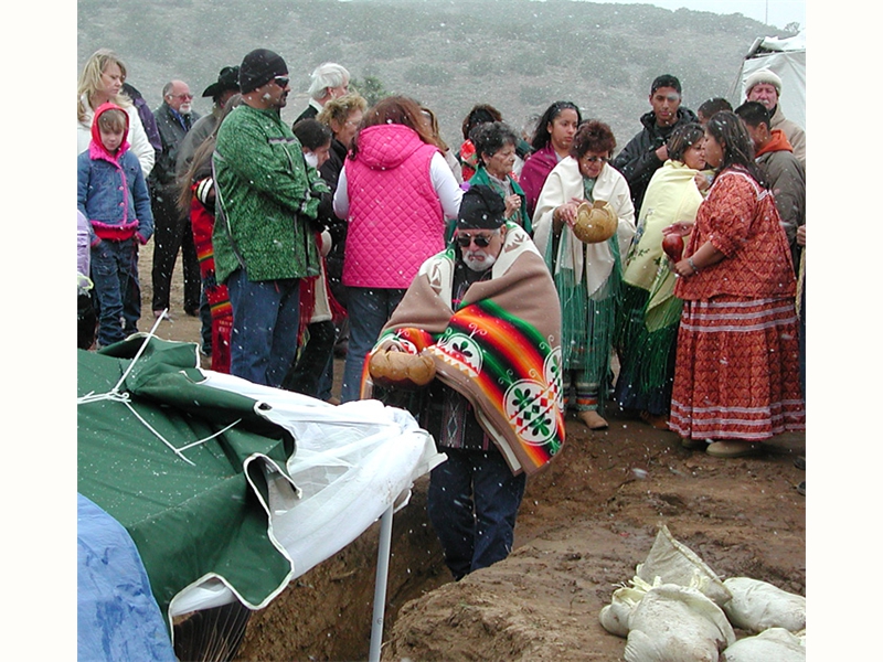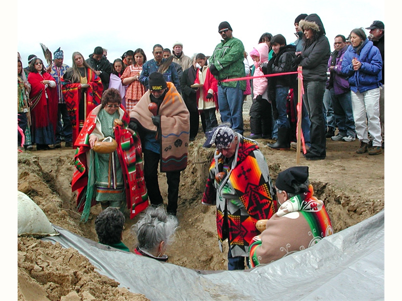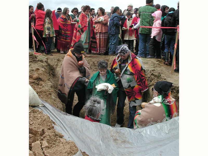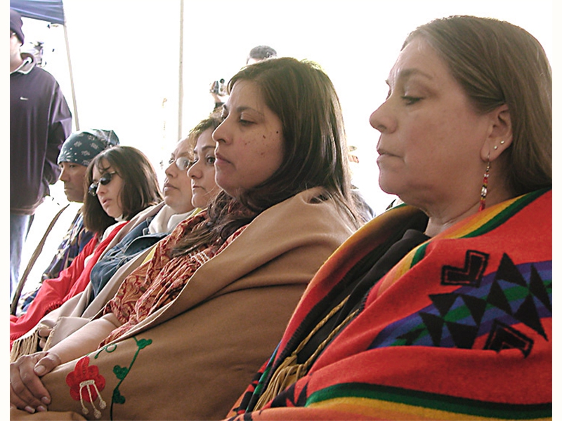 • From left: SFBMI elder Petra Valenzuela Felkins, elder Doris Martinez Smith, Chairman John Valenzuela and Vice Chairwoman Donna Smith Yocum (daughter of Doris) pray at one of the gravesites.