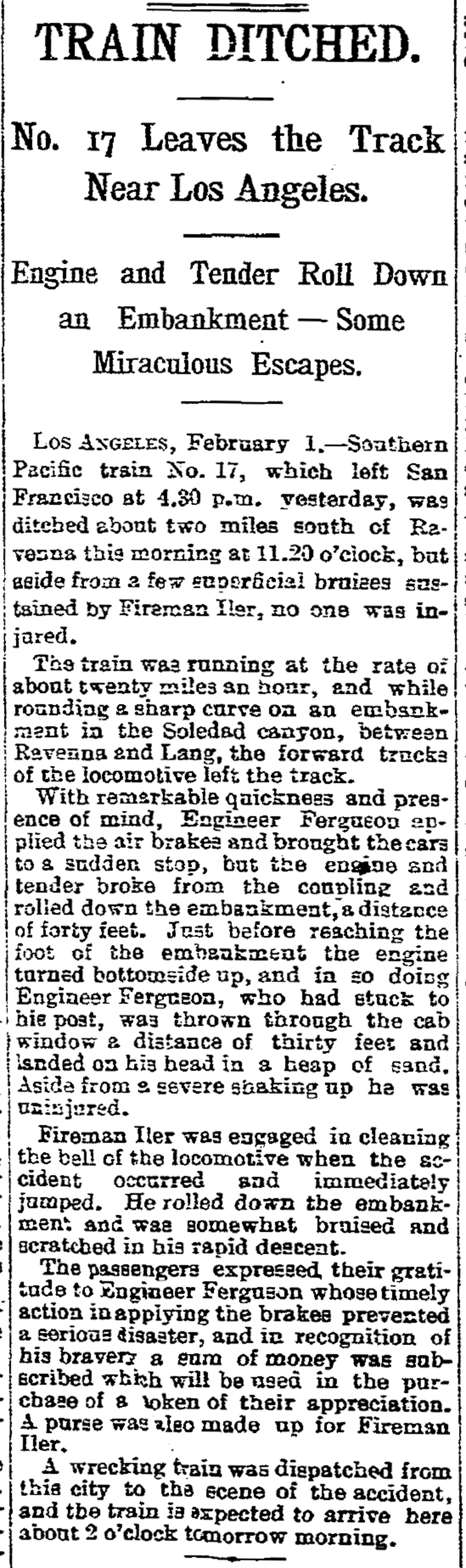 Los Angeles, February 1. — Southern Pacific train No. 17, which left San Francisco at 4:30 p.m. yesterday, was ditched about two miles south of Ravenna this morning at 11:20 o'clock, but aside from a few superficial bruises sustained by Fireman Iler, no one was injured.