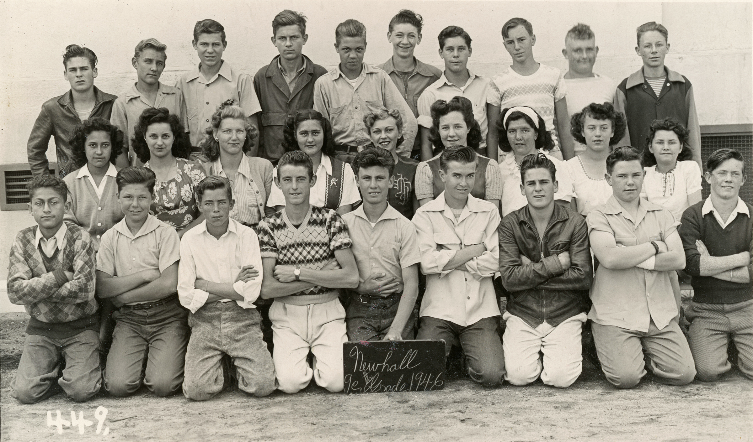 Hart High School 9th grade class, Group C (3 of 3), 1945-46. Hart, the Santa Clarita Valley's first high school, opened in 1945 with (only) 9th graders from all corners of the SCV. In 1945-46 they were housed on the Newhall Elementary School campus, where this photo was made; the separate high school was not yet built. These 9th graders went on to become the first Hart High graduates in 1949 ... the famous '49ers.