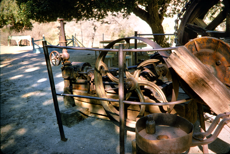 The two original jackline plants in Pico Canyon were mostly intact in 1974 when I was there. A brush fire had burned all of the wooden parts and the buildings, but the tin lay where it had fallen after the wood framework burned. The big iron and steel parts remained.