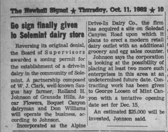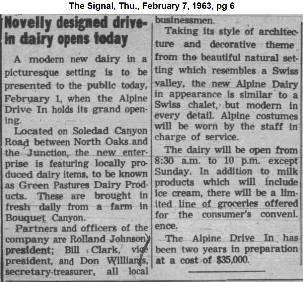 Clark was still in the picture. By 1965, Clark and the Williams family had built 12 retail outlets including the dairy store at 18717 Soledad Canyon Road in Canyon Country, which still stands in 2018. Opening in 1963, the store was separately incorporated as the Alpine Drive-In Dairy Co. (it mimicked a Swiss chalet in design), and its corporate officers were reported as Rolland Johnson, president; William J. Clark, vice president; and Warren Williams' son Don Williams, secretary-treasurer. In 1965, Clark said Green Pastures was operating 24 milk routes from San Gabriel to Lancaster and had 87 people on payroll.