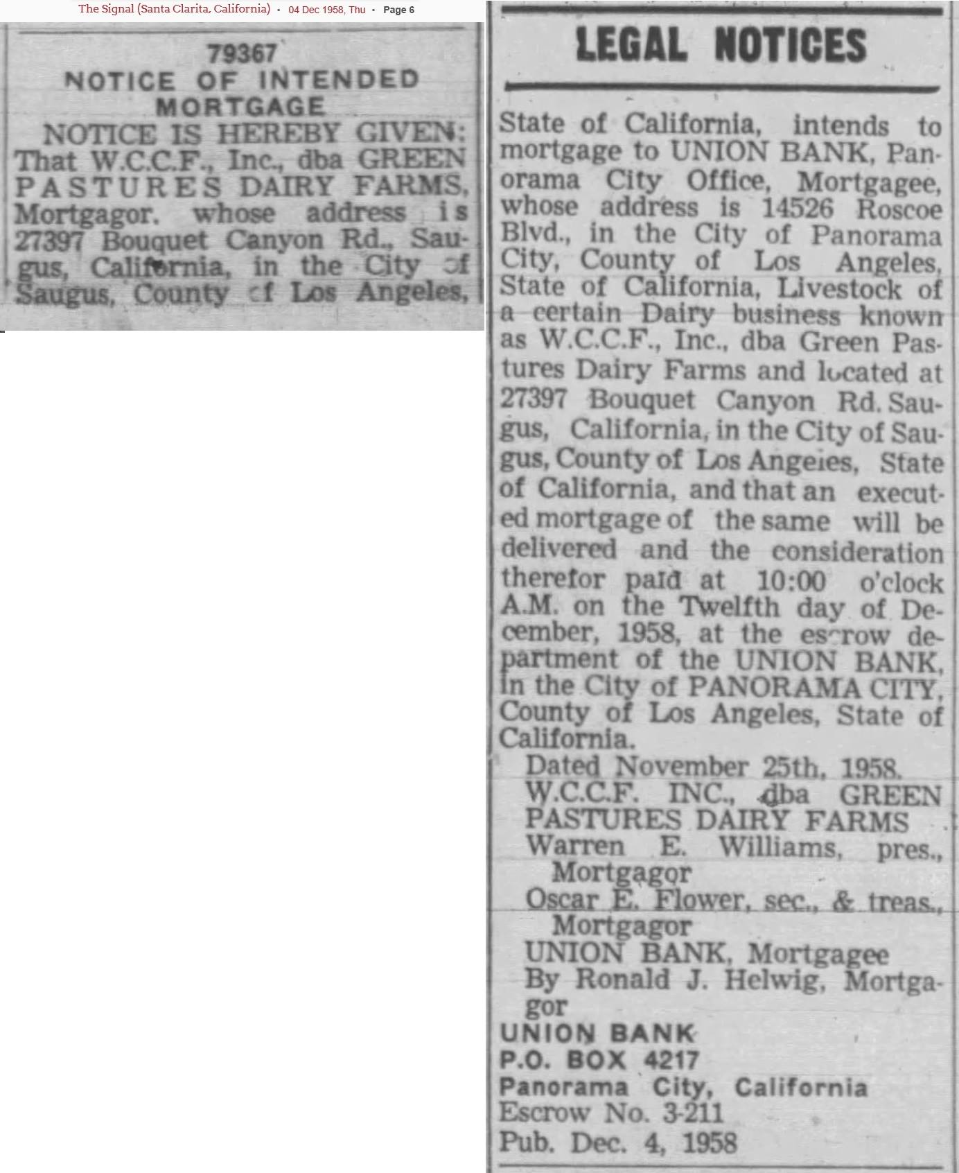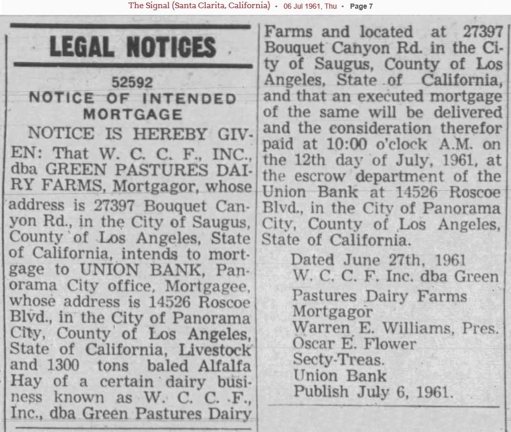 At the end of 1958, Williams transfered ownership of the Green Pastures Dairy operation to his own closely held corporation, W.C.C.F. Inc., of which Williams was president. He was still at the helm in 1961 when W.C.C.F., dba Green Pastures, mortgaged the property to finance a new processing plant in the San Fernando Valley with