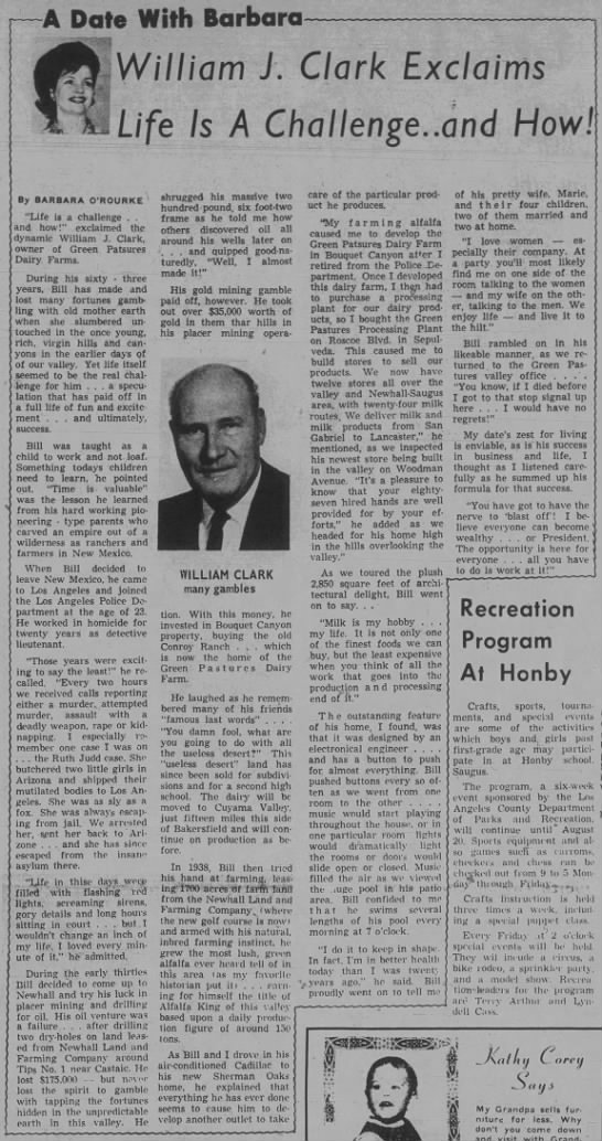 Clark had developed an interest in farming in 1938 when he sharecropped alfalfa on a 1,700-acre leasehold from Newhall Land, billing himself as the Alfalfa King. Retired from LAPD by 1945, he apparently purchased the Conroy Ranch on Bouquet Canyon Road — which he and his LAPD partners had previously leased for oil exploration — and ran it as the W.J. Clark Ranch, proffering hay until the early 1960s. At some point he established the Green Pastures Dairy and purchased the preexisting Green Pastures Processing Plant on Roscoe Boulevard in Sepulveda (North Hills) to process and distribute his dairy products.