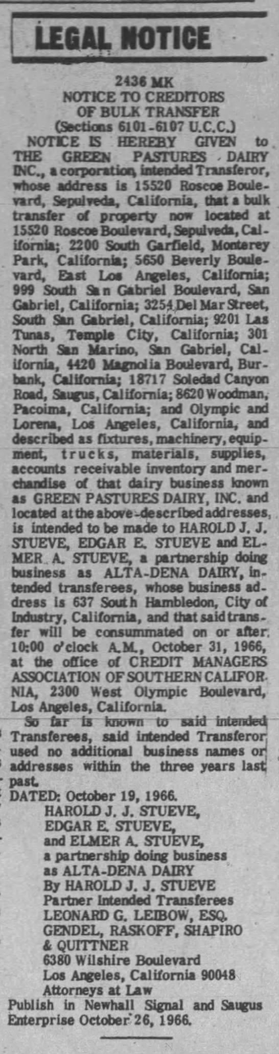 By late 1966, W.C.C.F. had sold the entire operation to one Harold J.J. Stueve, who on October 31, 1966, transfered it to the Stueve family partnership — Harold, Edgar and Elmer — known to the public as Alta-Dena Dairy.