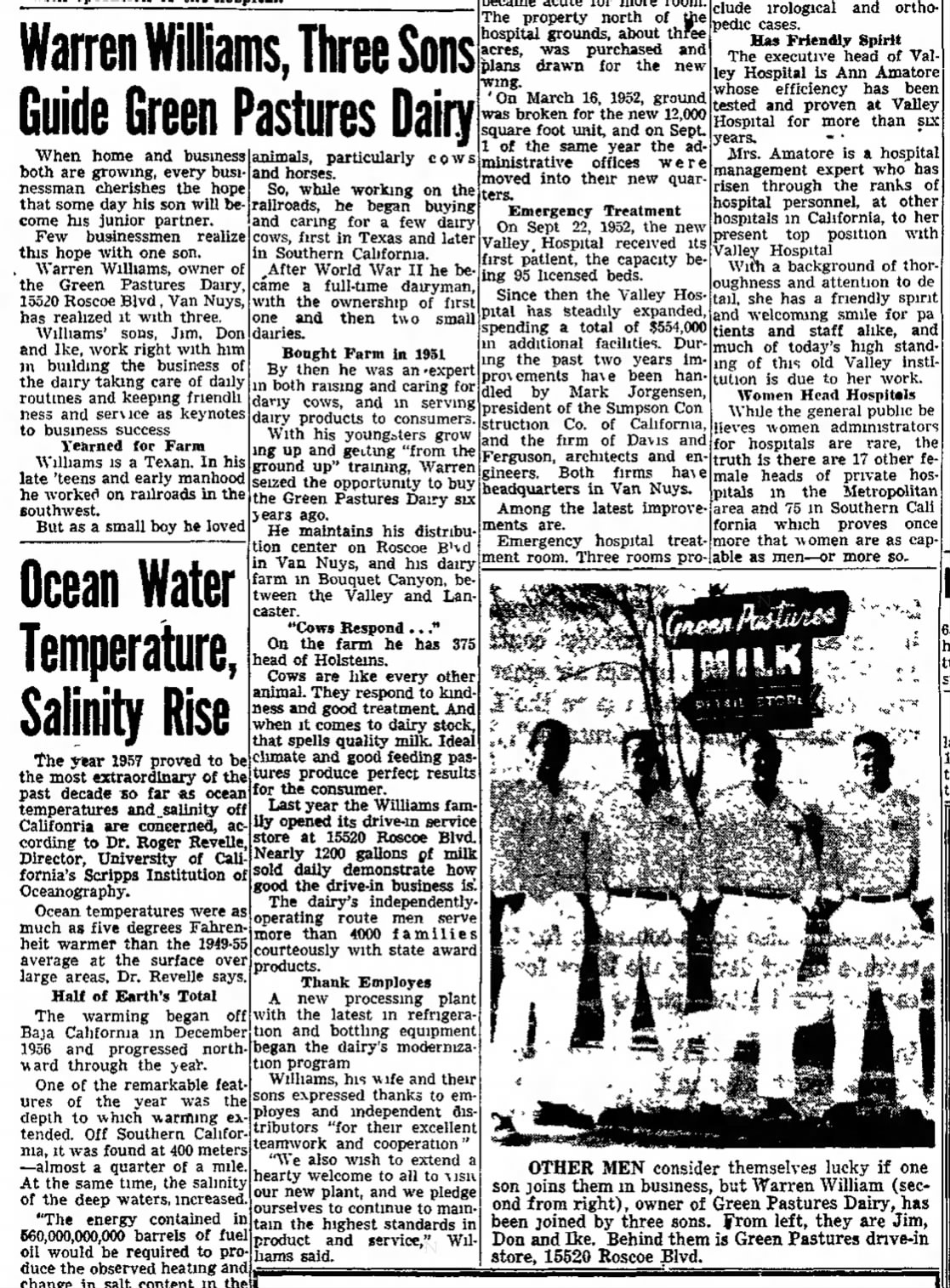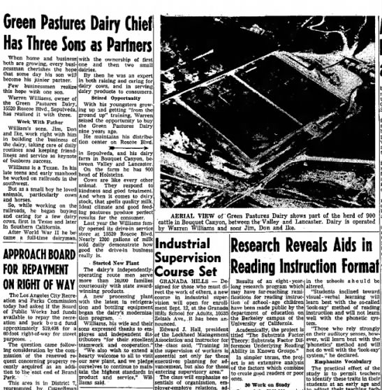 Enter Warren E. Williams, a Texan who came out (farther) west in his teens to work on railroads. News reports state Williams bought the Green Pastures farm in Bouquet Canyon in 1951 and operated it in partnership with his three sons, Jim, Don and Ike. He also purchased the processing plant in Sepulveda and started opening retail dairy outlets in the San Fernando and San Gabriel valleys.