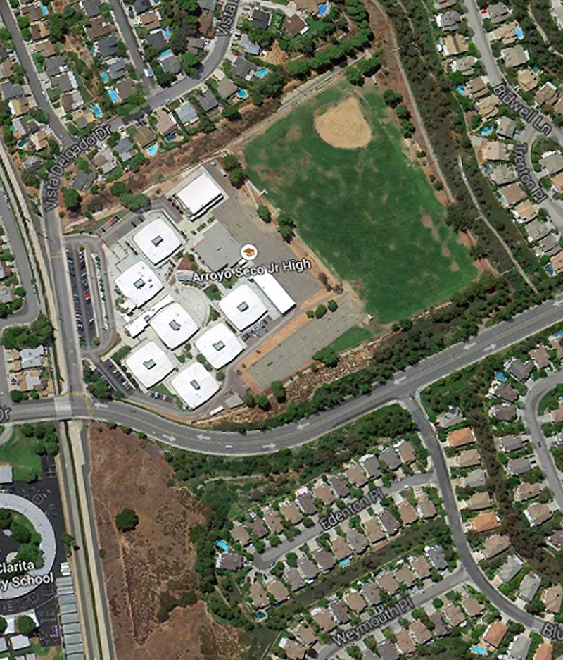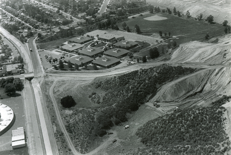 Decoro Drive under construction by The Newhall Land and Farming Co. in Seco Canyon, ~1990. The view is to the east (east at top). Seco Canyon Road would be just out of frame to the left. The main buildings in the photograph are Arroyo Seco Junior High School in the William S. Hart Union High School District. The circular structure at lower left is the back side of Santa Clarita Elementary School in the Saugus Union School District.