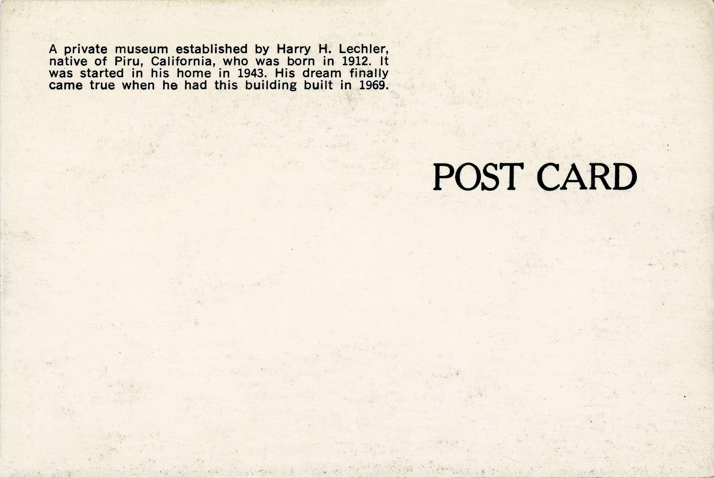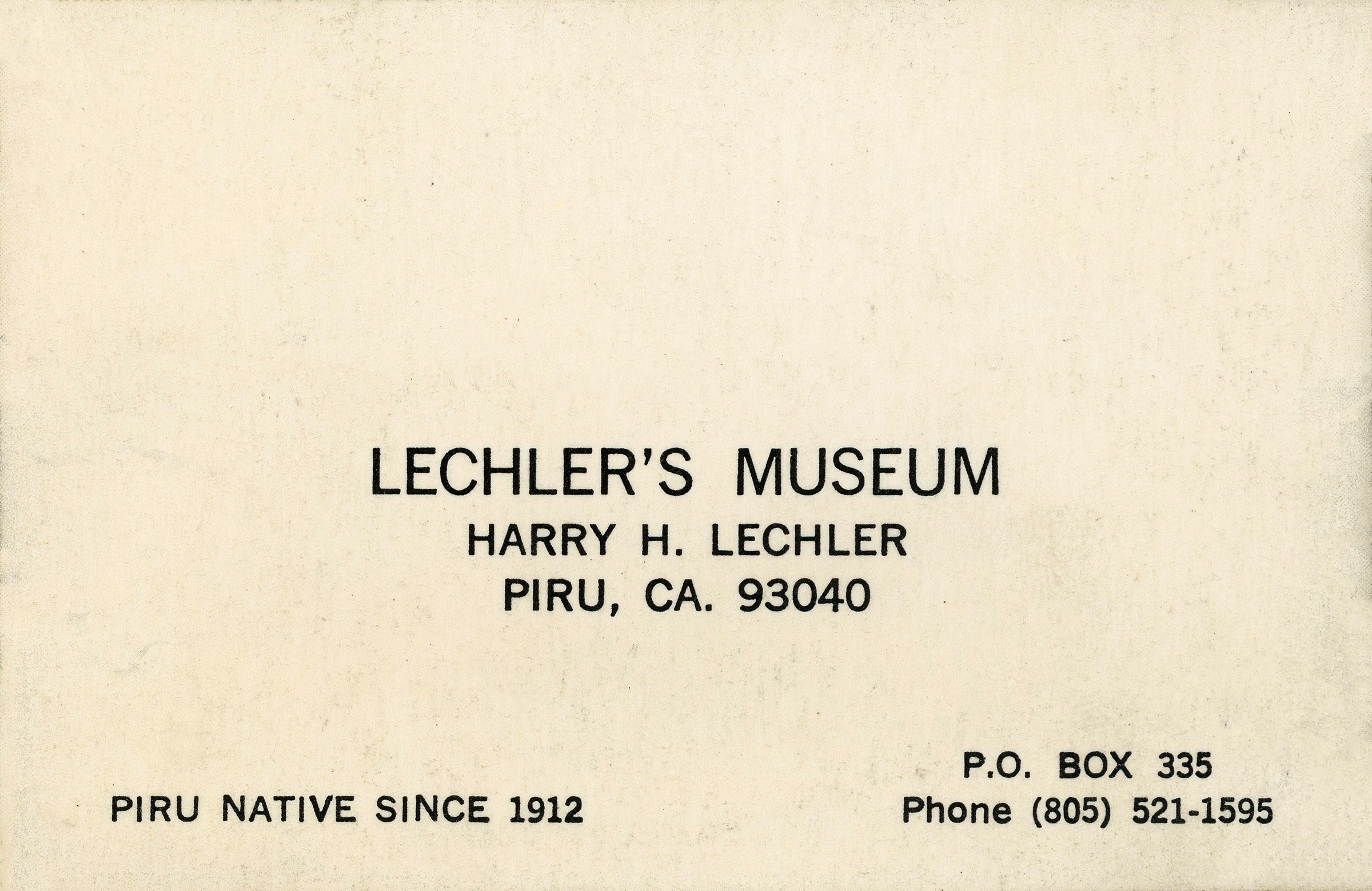 Postcard and business card for Harry Lechler's private museum in Piru, which held a treasure trove of artifacts from the Santa Clara River Valley (upper and lower).