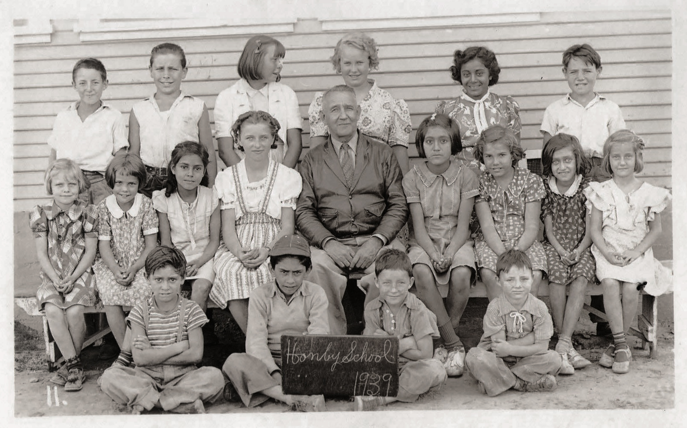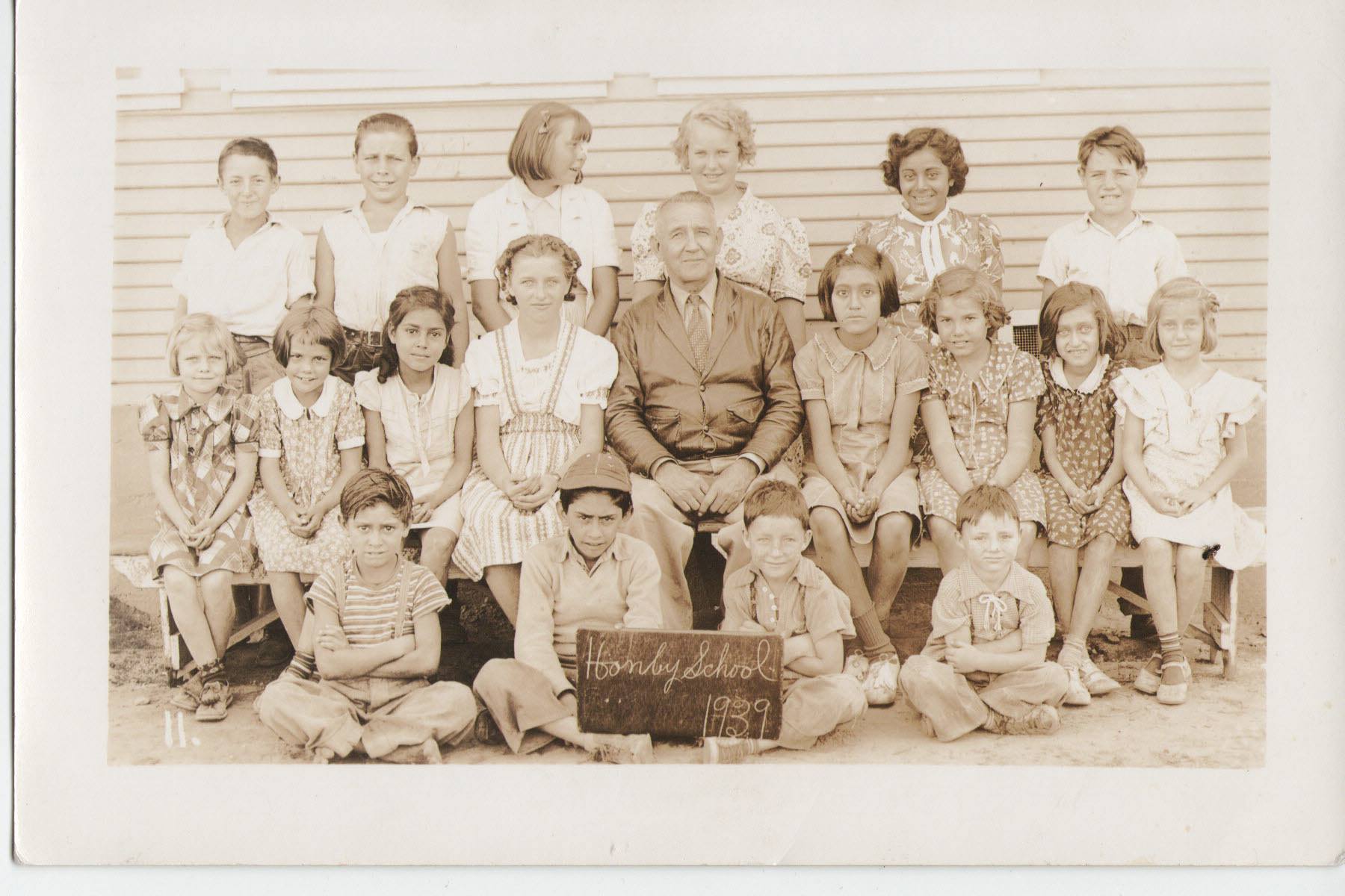 The entire student body of Honby School, grades K-8, pose with their teacher, Mr. Stuckey, for a 1939 class (school) picture.