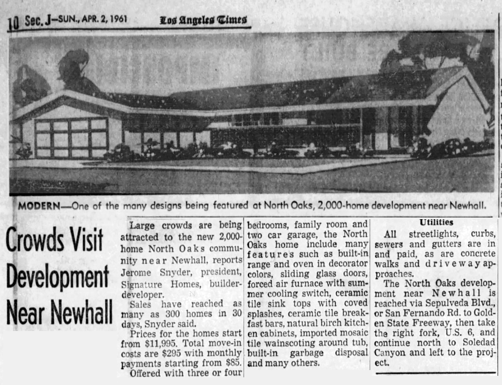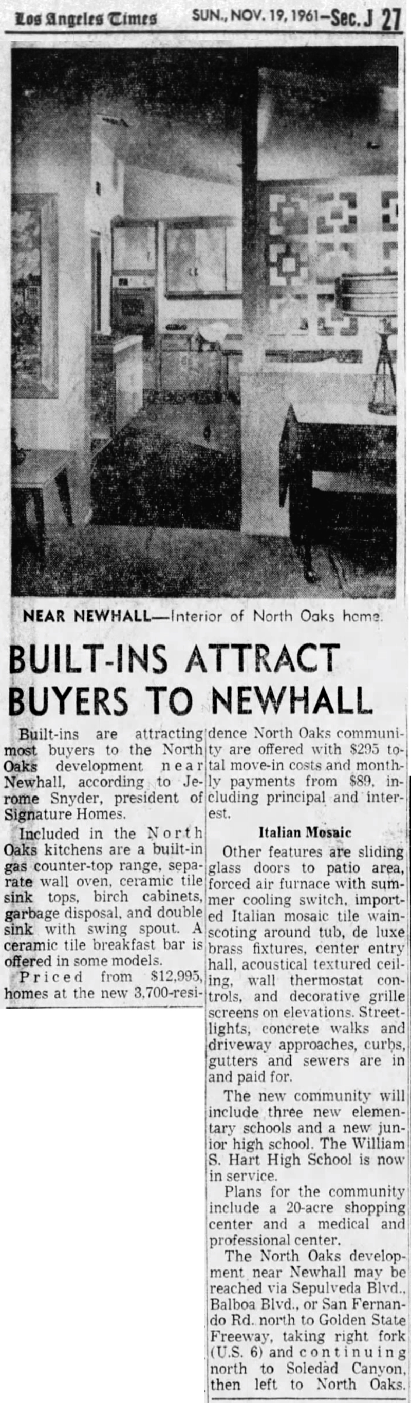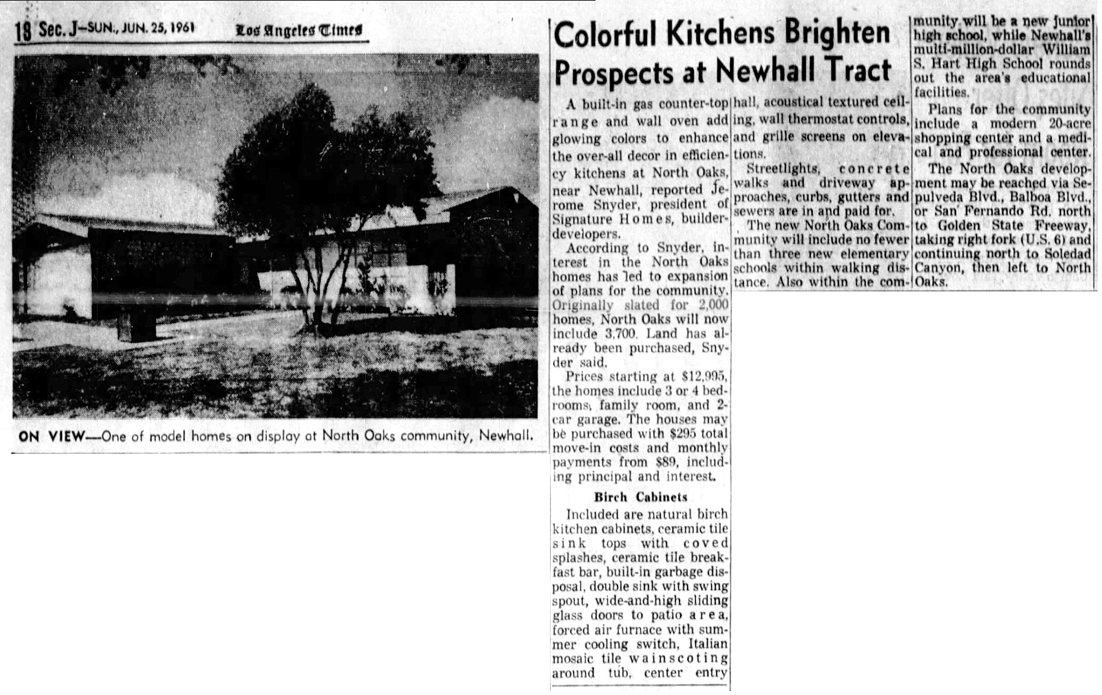 So brisk were sales that entry prices skyrocketed from $11,995 in April 1961 to $12,995 in June, and developer Jerome Snyder of Signature Homes announced the purchase of more land for an additional 1,700 home sites (total 3,700).