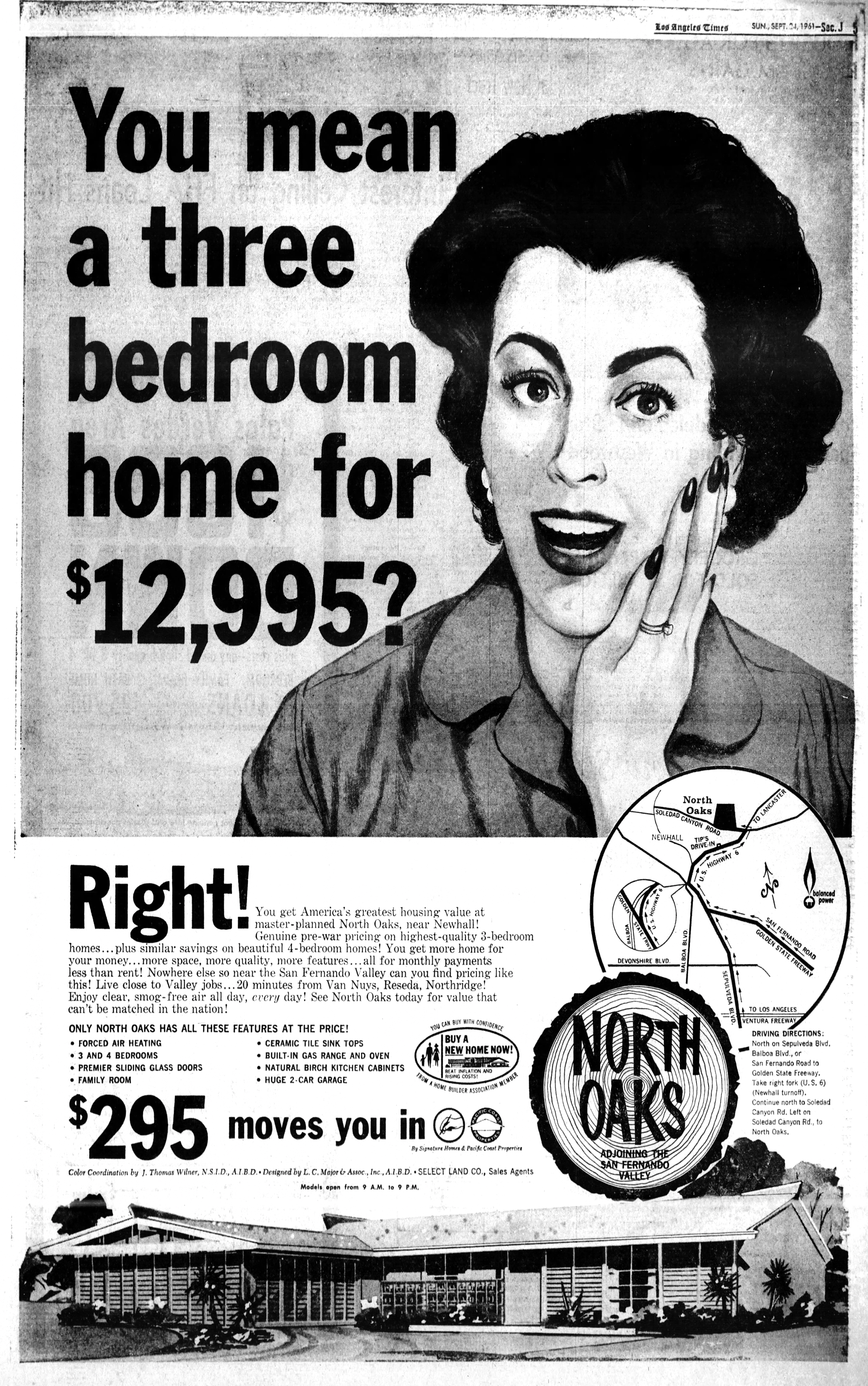 Where can you find "genuine pre-war pricing" on spacious 3- and 4-bedroom homes complete with sliding-glass doors, birch kitchen cabinets and a "huge 2-car garage?" Look no farther than the brand-new, 2,000-home North Oaks development near Newhall. (A decade later, "near Newhall" became "near Magic Mountain.")