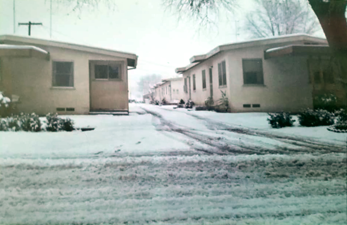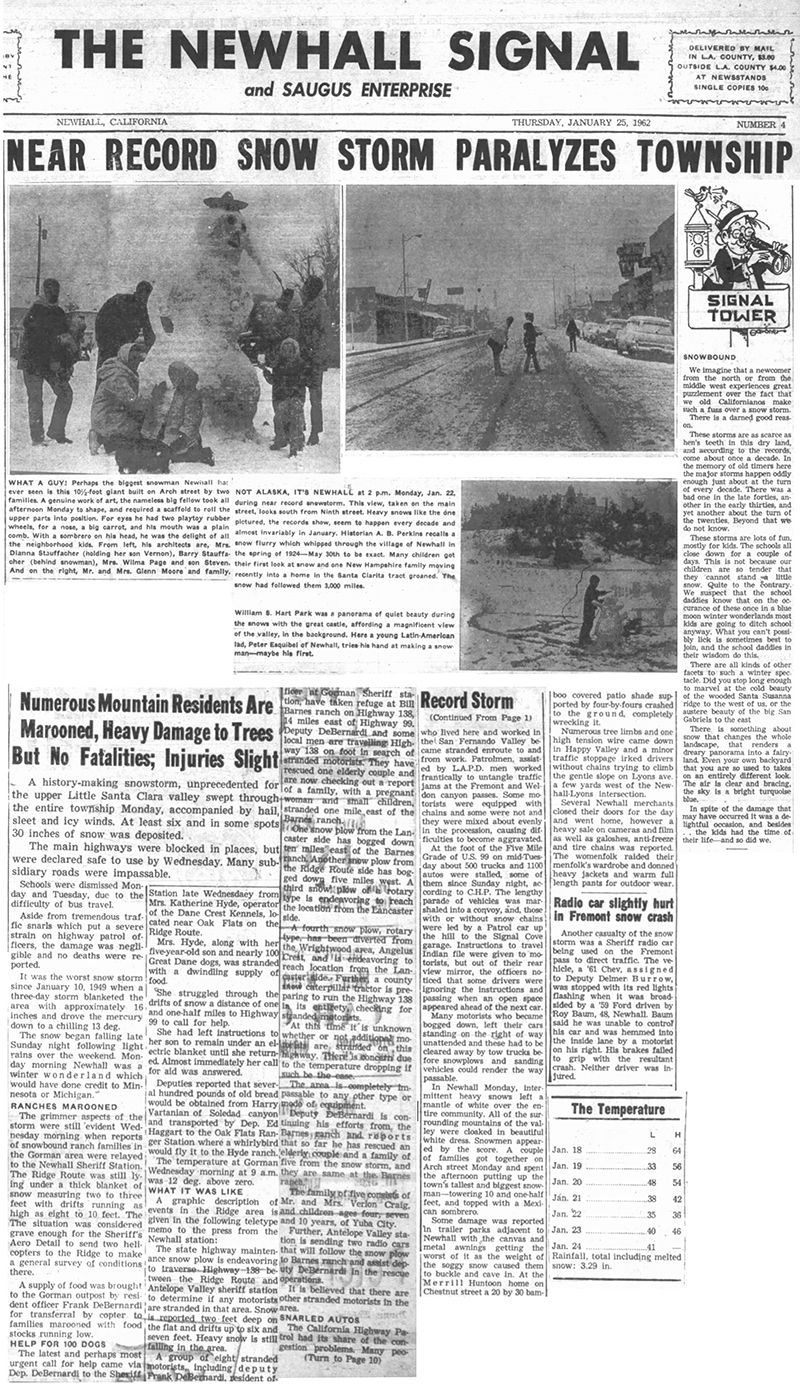 In Newhall Monday, intermittent heavy snows left a mantle of white over the entire community. All of the surrounding mountains of the valley were cloaked in beautiful white dress. Snowmen appeared by the score. A couple of families got together on Arch street Monday and spent the afternoon putting up the town's tallest and biggest snowman — towering 10 and one-half feet, and topped with a Mexican sombrero.
