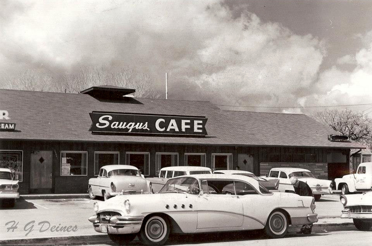 In 1952, new owner Bill Rolls erected a new, 3,427-square-foot building, perpendicular to and set slightly back from the earlier structure. This is the current Saugus Café building at 25861 Railroad Ave.