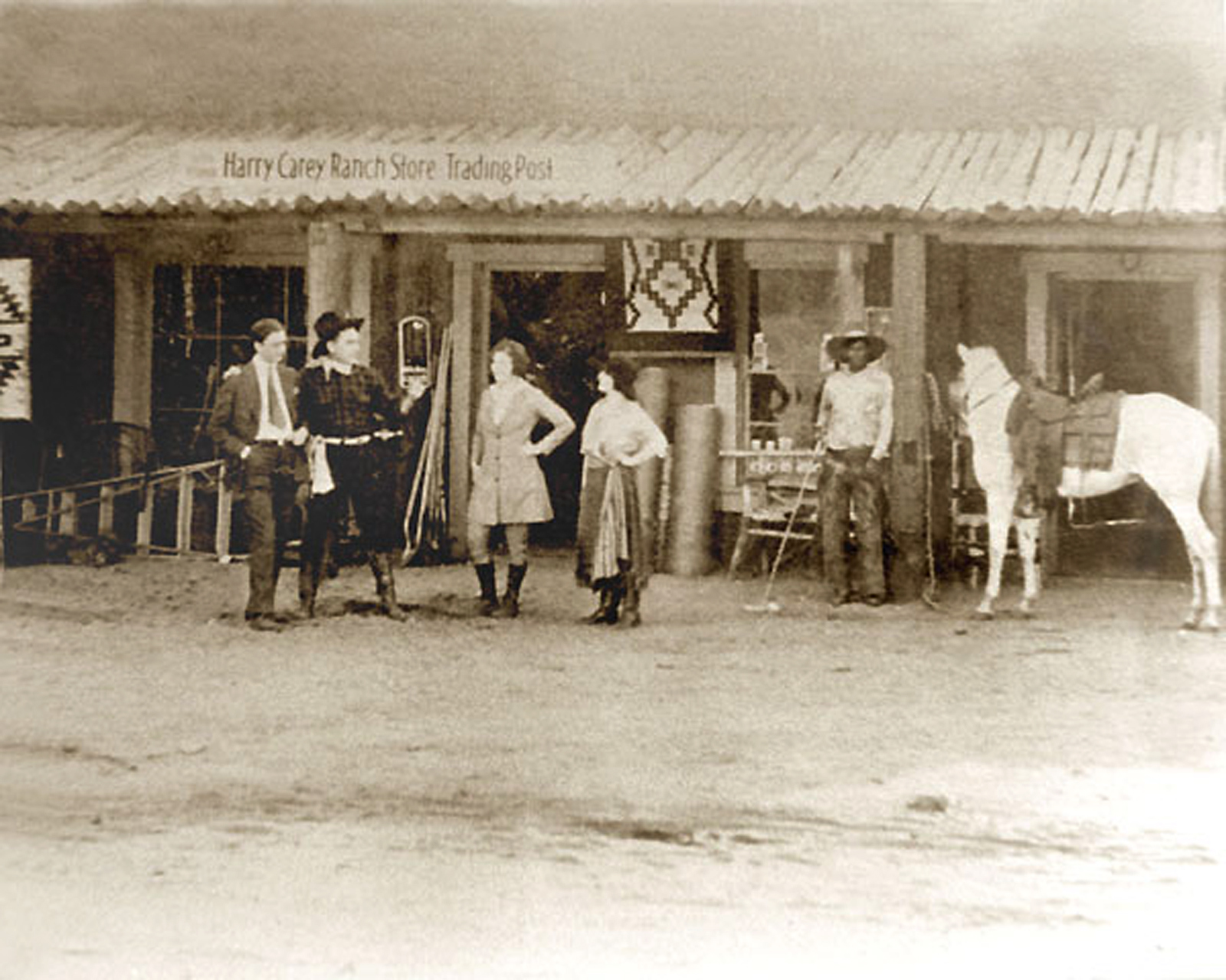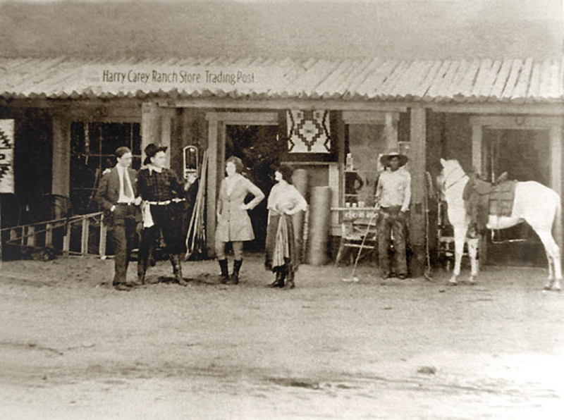 Harry Carey Ranch Store Trading Post, 1910s-20s. Harry Carey is standing second from left. Photo originally from the collection of Anita Ruby Kellogg.