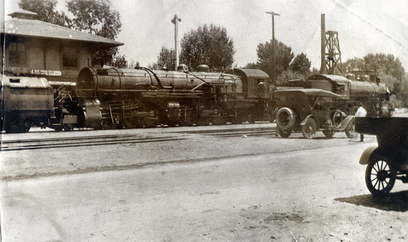 Two locomotives in front of the Southern Pacific Railroad's 1887 Saugus depot in the late 1910s. At the time, the depot sat at the