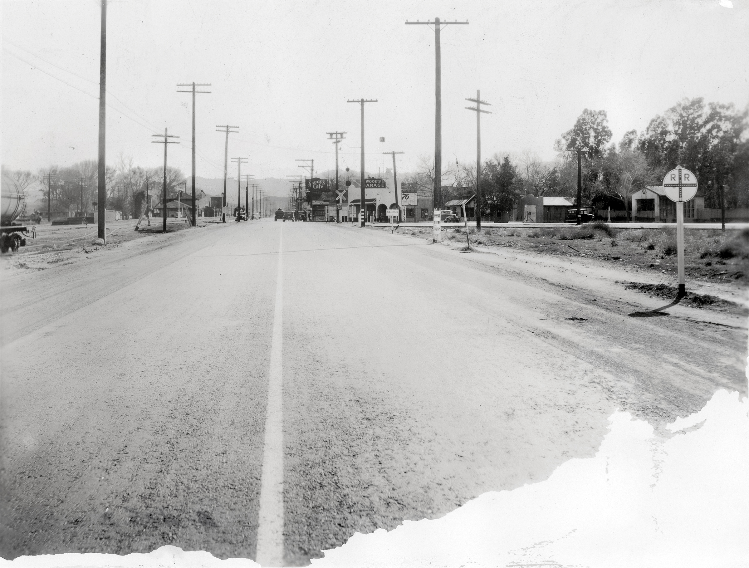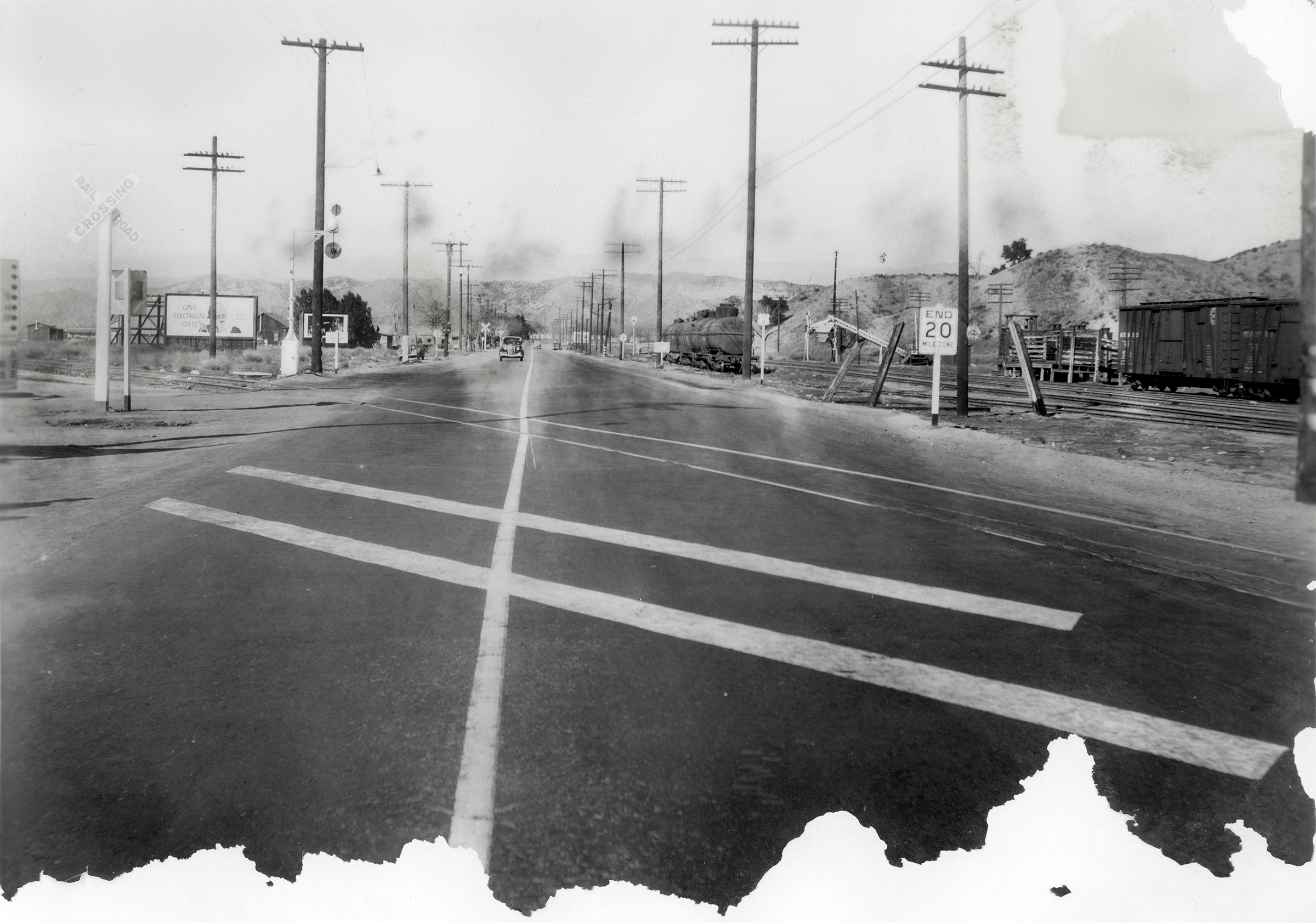 January 4, 1938 — Two views, one looking south (above) and the other north (below) from Saugus Junction. 6¼x8½-inch prints, damaged (probably water damage), especially at the bottom edge. The same forgotten photographer also shot photos of Newhall Junction on the same date. Two months later, the Great Flood of 1938 would make a mess of these scenes. Saugus Junction was the point where the 1887 Southern Pacific spur line (train tracks) left the Saugus Depot and crossed Bouquet Canyon Road, heading west down the Highway 126 corridor to Ventura. Most of those reference points being meaningless to the modern viewer, the Saugus Depot stood at the southeast corner of Bouquet Canyon Road and Drayton Street, where a lumber yard and building supply company later stood (stands). The tracks crossed the road at what is now Magic Mountain Parkway. (The tracks are gone and the Saugus Depot is in Newhall today, but that's another story.) Above: The photographer is standing about 50 yards north of the junction and looking south. The SPRR Saugus Depot is visible at left. It looked like this at the time. The Saugus Café, Fielding Wood's sandwich shop and Wood's Garage are on the right (west) side of the road, center of photograph. Highway 126 (today's Magic Moutain Parkway) is the road that starts in front of Wood's Garage and runs to the right (west). The tracks are there, too, but they're hard to see. The back of the photograph is numbered BE-448.7 #1. Below: The photographer is standing almost on top of the junction and looking north. What you can't quite see at far left is this wayfinding sign — only the edge of it. Note the billboards at left (west) and the "End 20 Mile Zone" (speed limit) sign at right (east). The wooden structure next to the boxcar at right is for loading livestock. The metal structure to the left of it (behind and to the left of the speed-limit sign) is for loading grain. Up ahead in the distance, the shimmering light (more water damage) would lead a motorist to Soledad Canyon Road and Bonelli Stadium (Saugus Speedway). The back of the photograph is numbered BE-448.7 #6.