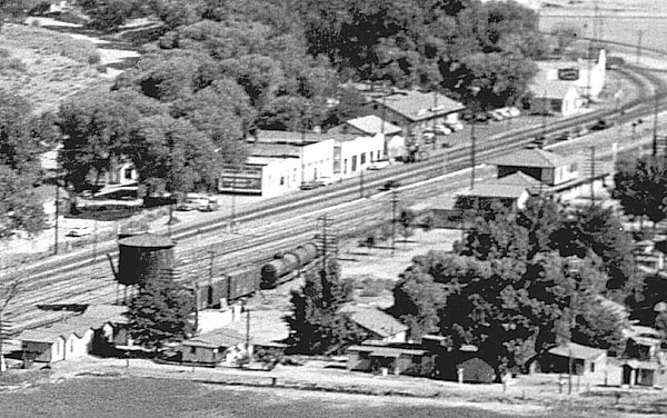 This is the downtown business district as it appeared in the mid-1950s, looking north. Clearly visible are the Saugus Train Station at right, the water tank and the businesses lining the west side of San Fernando (Bouquet Canyon) Road, including the Saugus Café (directly above the train station in the photo).