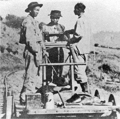 Chinese immigrants provided the labor that united a state. This trio, diving a handcar in the Tehachapis, is among the 3,000 hired by Southern Pacific President Charles Crocker to complete the railroad's San Joaquin Valley line 2,000 to lay the tracks and another 1,000 to dig the San Fernando Tunnel between Newhall and the San Fernando Valley. Unknown numbers died during construction. | ||